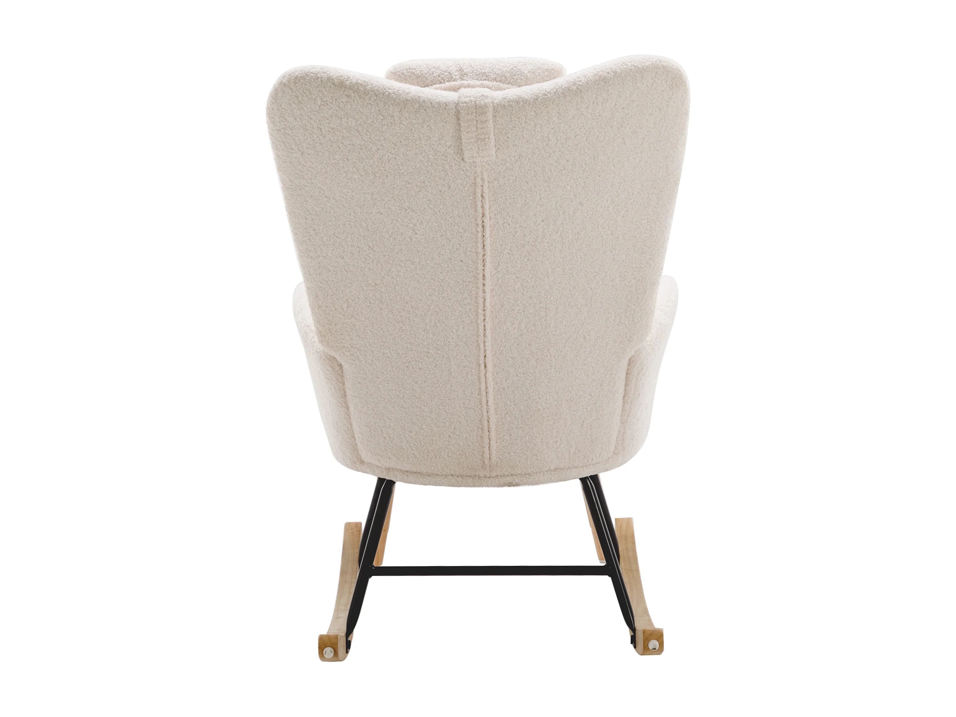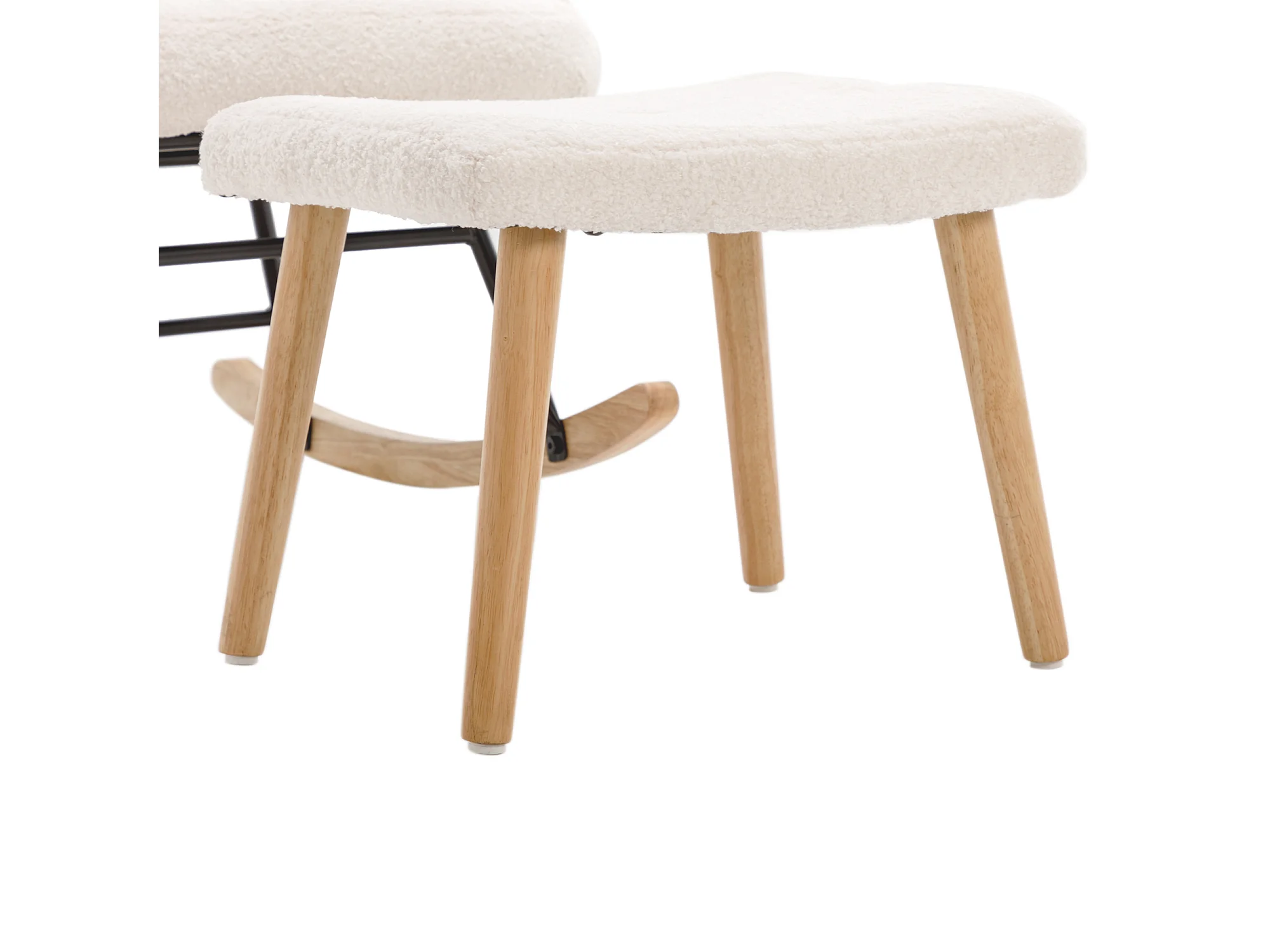 Fauteuil à bascule, rocking chair avec tabouret, cadre en métal et pieds en bois, tissu en Teddy blanc