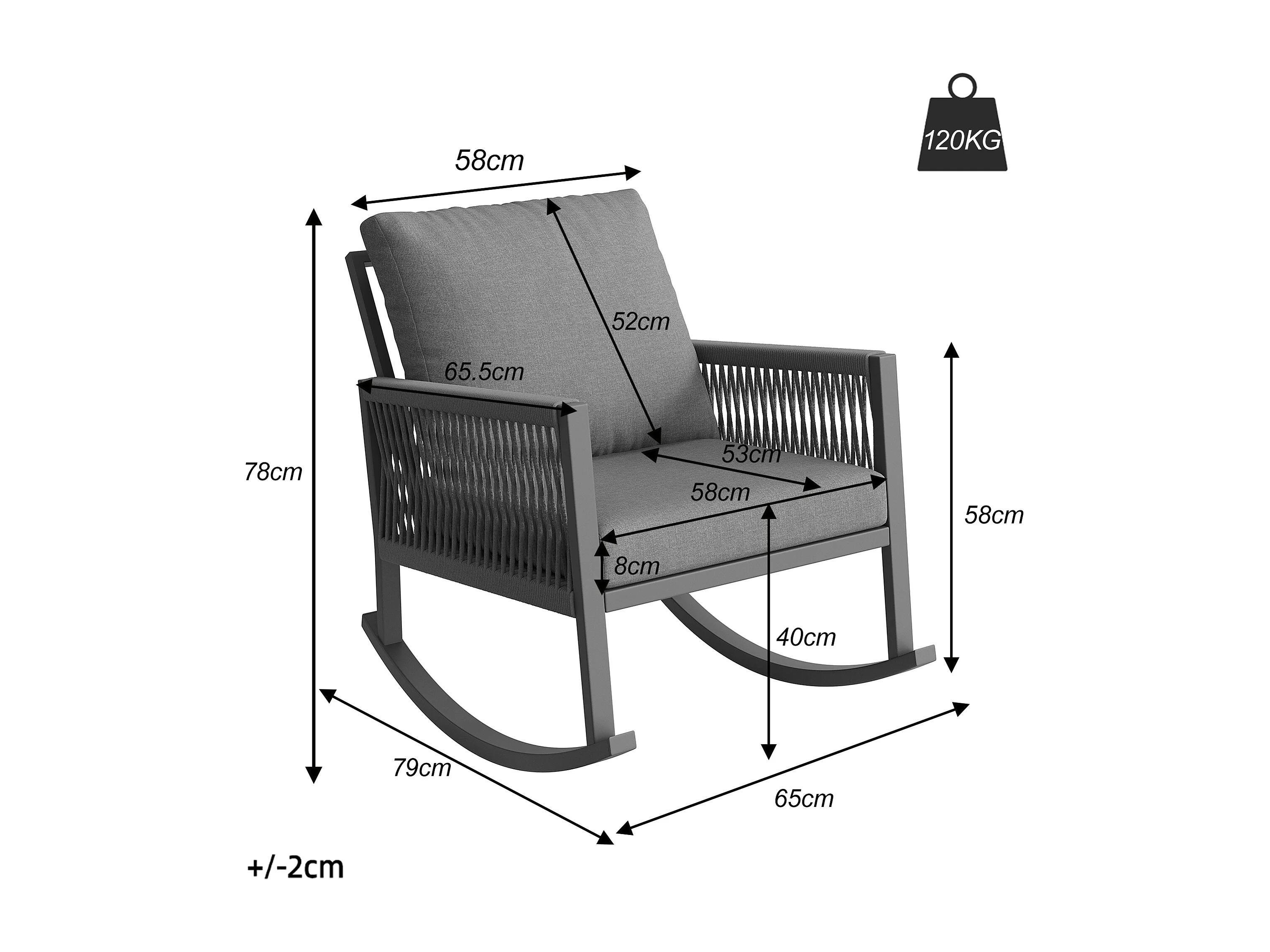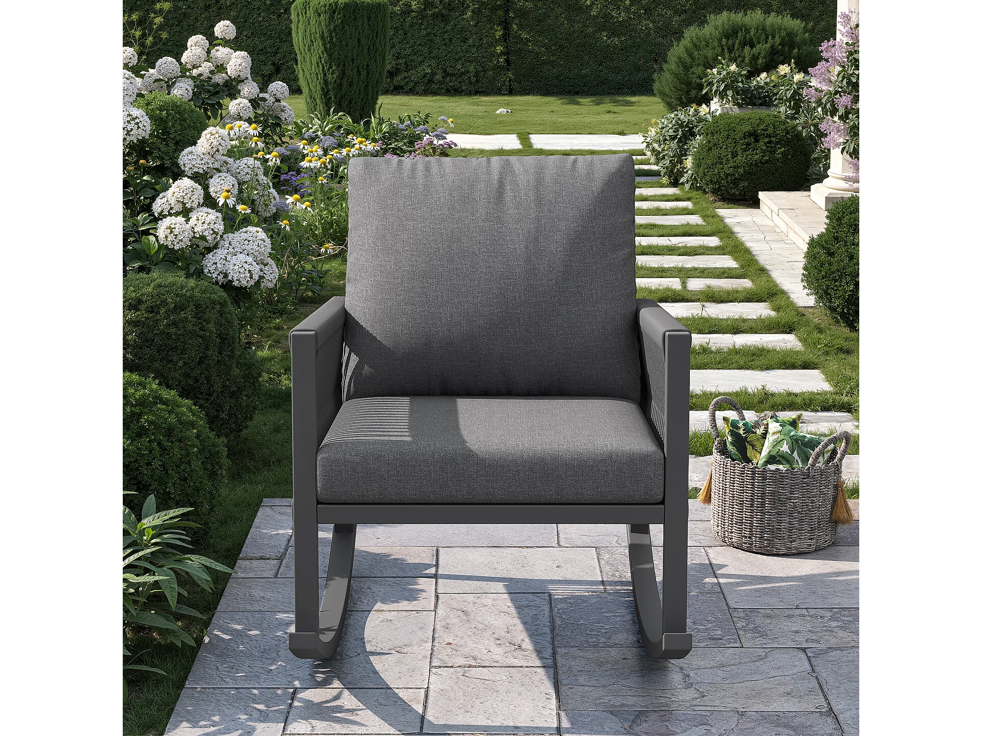 Fauteuil à Bascule de Jardin avec Accoudoirs en Corde Tressée Croisée - Rocking Chair d'Extérieur Design Moderne - Structure Métal - Gris