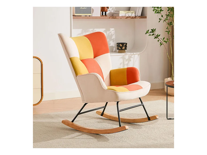Fauteuil à bascule en patchwork pour le salon en velours avec cadre en métal et base en bois