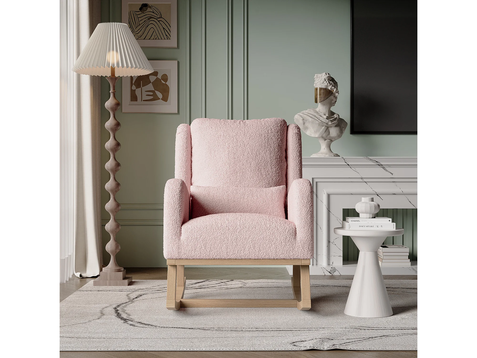 Fauteuil à bascule en Tissu velours Teddy - fauteuil de relaxation - avec 2 poches latérales et pieds en bois - style scandinave - rose