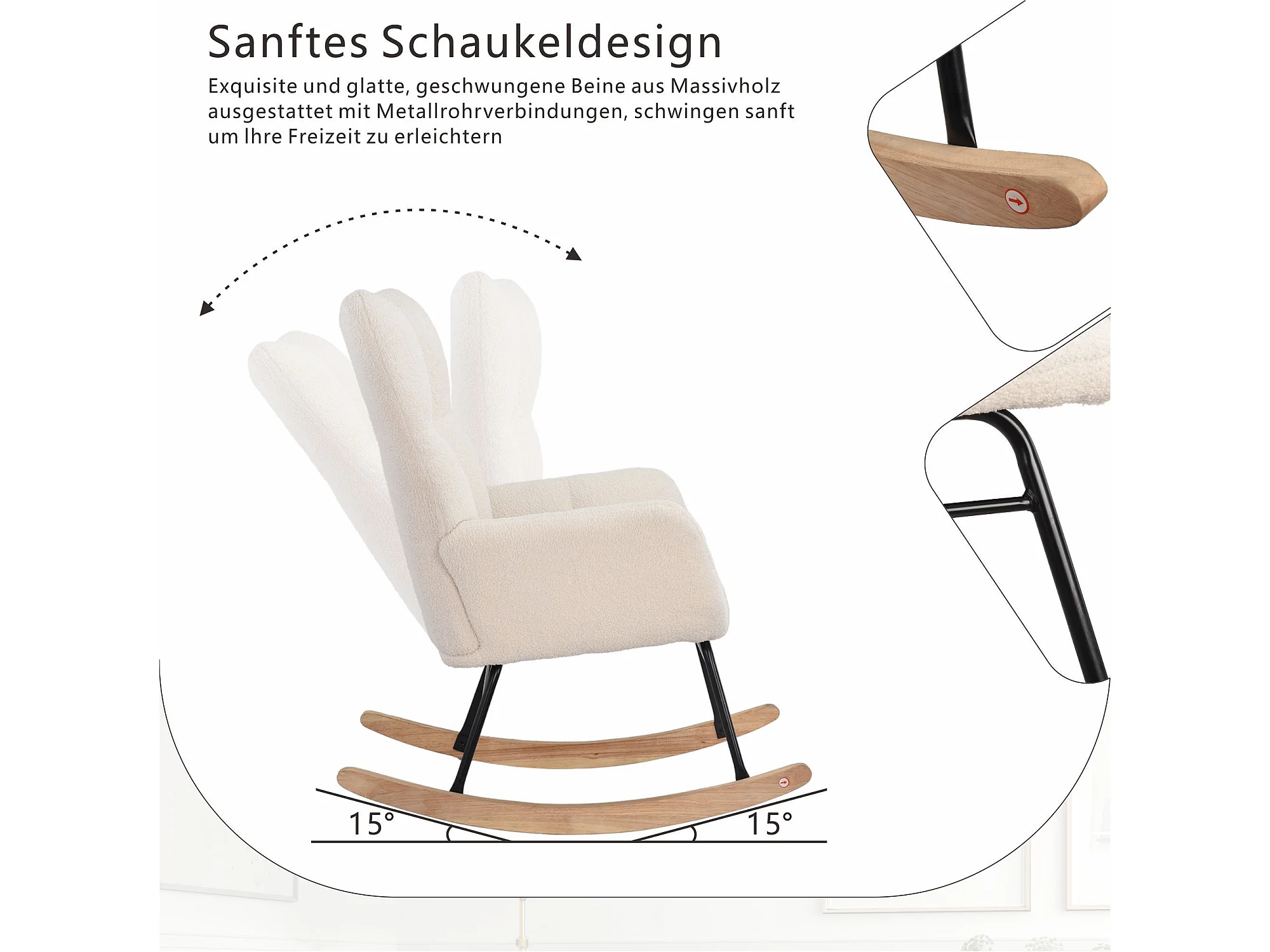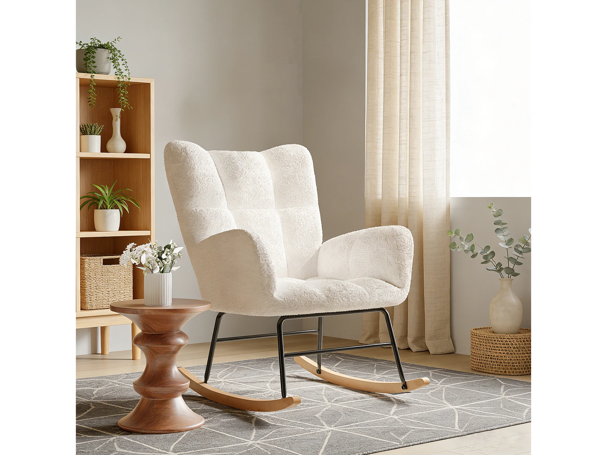 Fauteuil à bascule en velours Teddy - rocking chair pieds en bois - style scandinave et cream - beige