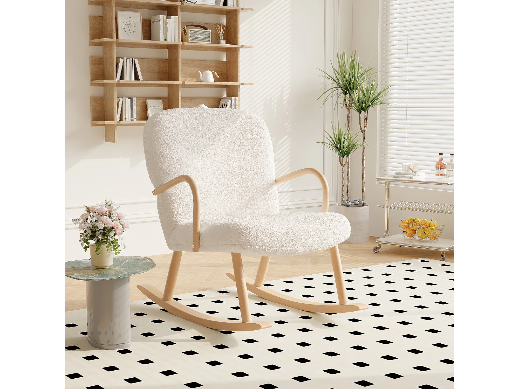 Fauteuil à bascule moderne en velours Teddy - Fauteuil à bascule avec accoudoirs - Pour salon, chambre à coucher, balcon - Charge maximale : 113 kg - Blanc