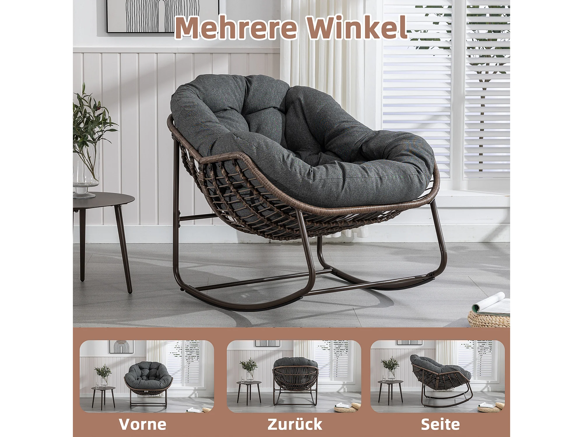 Cocon - Fauteuil à Bascule en Rotin Naturel - Forme Œuf et Coussin Gris Anthracite - Confortable pour Salon, Véranda ou Chambre