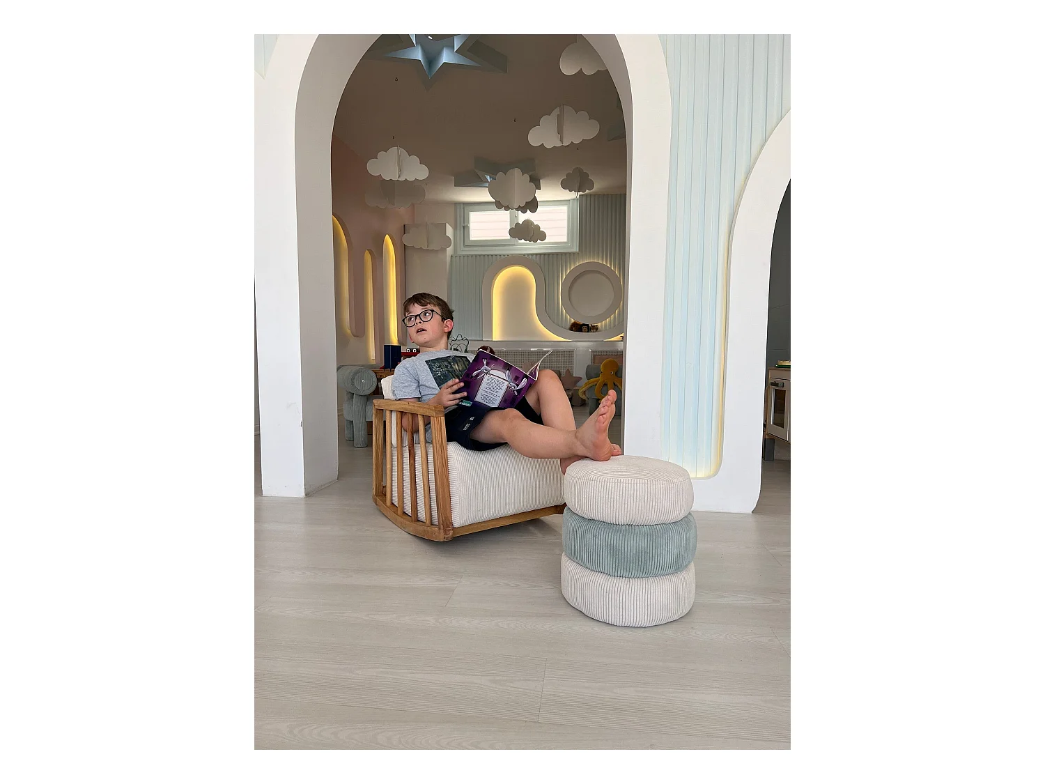 Fauteuil à bascule rembourré pour enfant Sereno Velours côtelé Blanc et Bois massif foncé