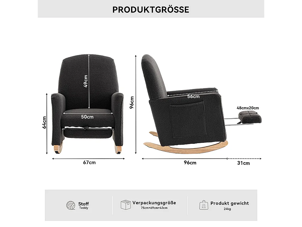 Fauteuil à bascule repose-pieds relax ottomane intérieur dossier haut salon Teddy gris foncé