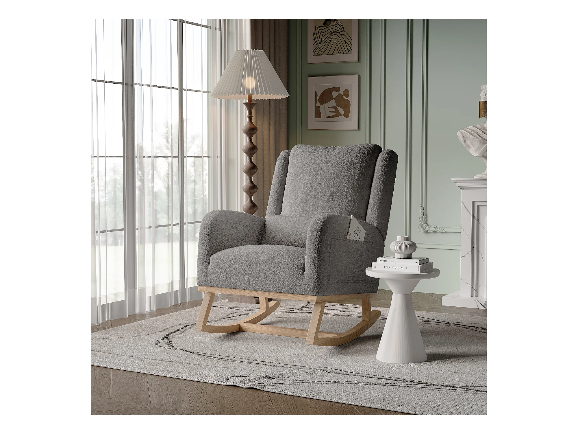 Fauteuil à Bascule, Rocking Chair, Chaise à bascule moderne en tissu teddy avec siège rembourré de mousse et cadre en bois