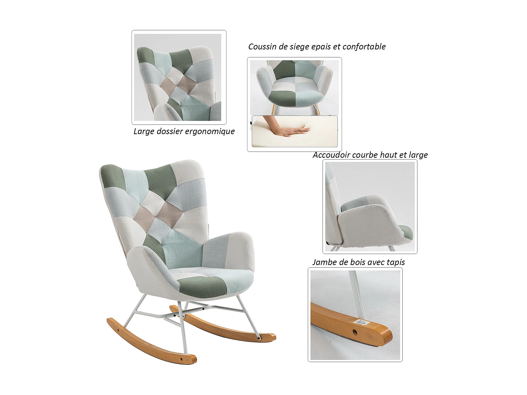 MEUBLES COSY Fauteuil à bascule allaitement scandinave rocking chaise loisir et repos en tissu patchwork avec pieds en bois massif et métal