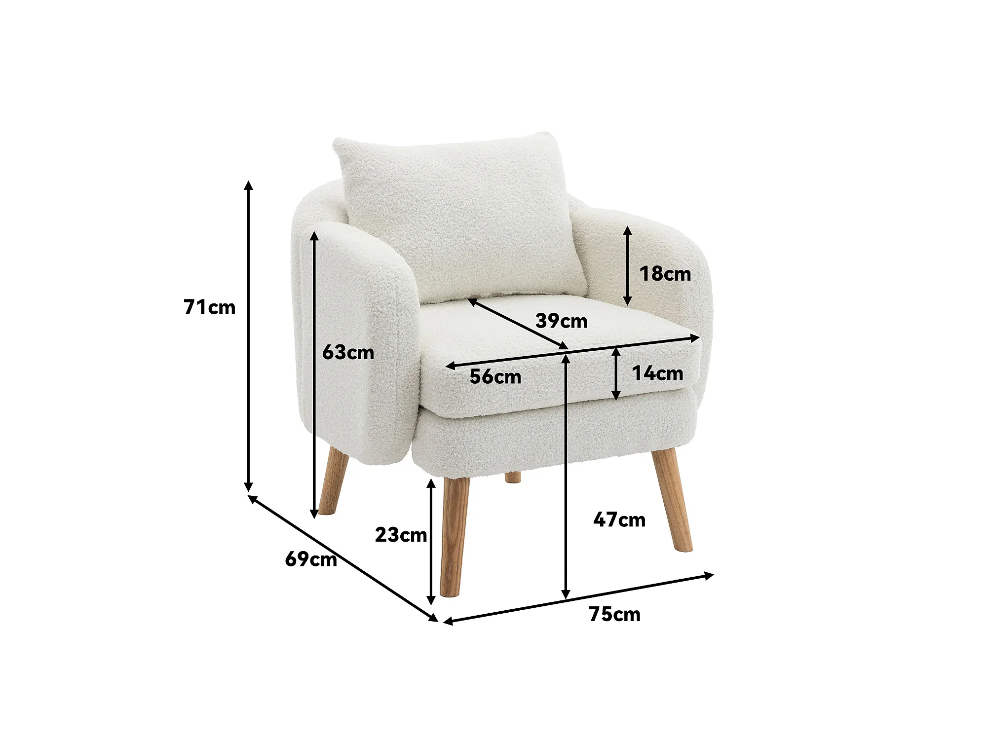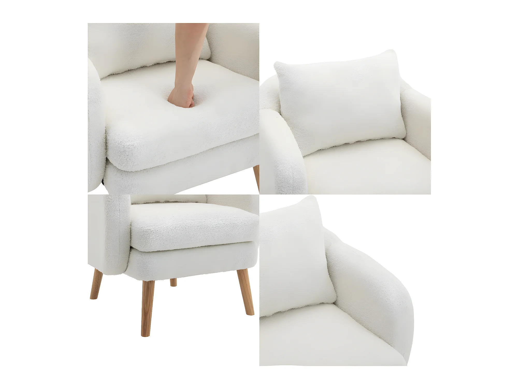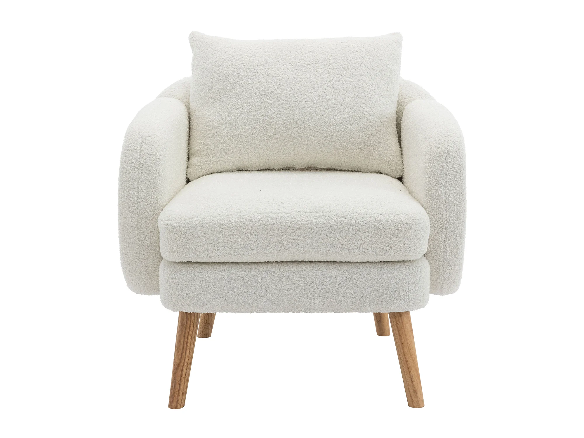 Fauteuil en tissu bouclette avec coussin épais - pieds en bois massif - blanc