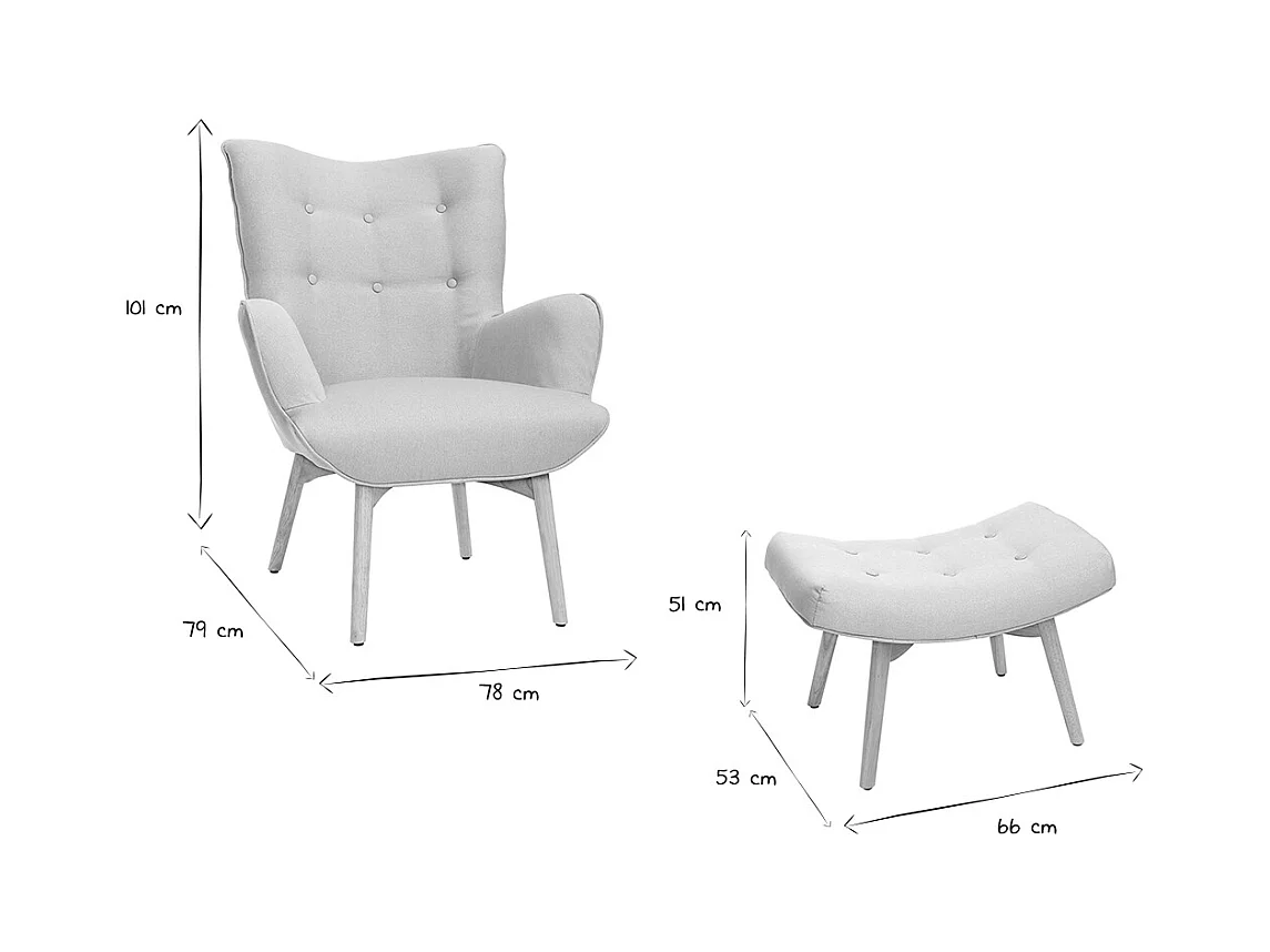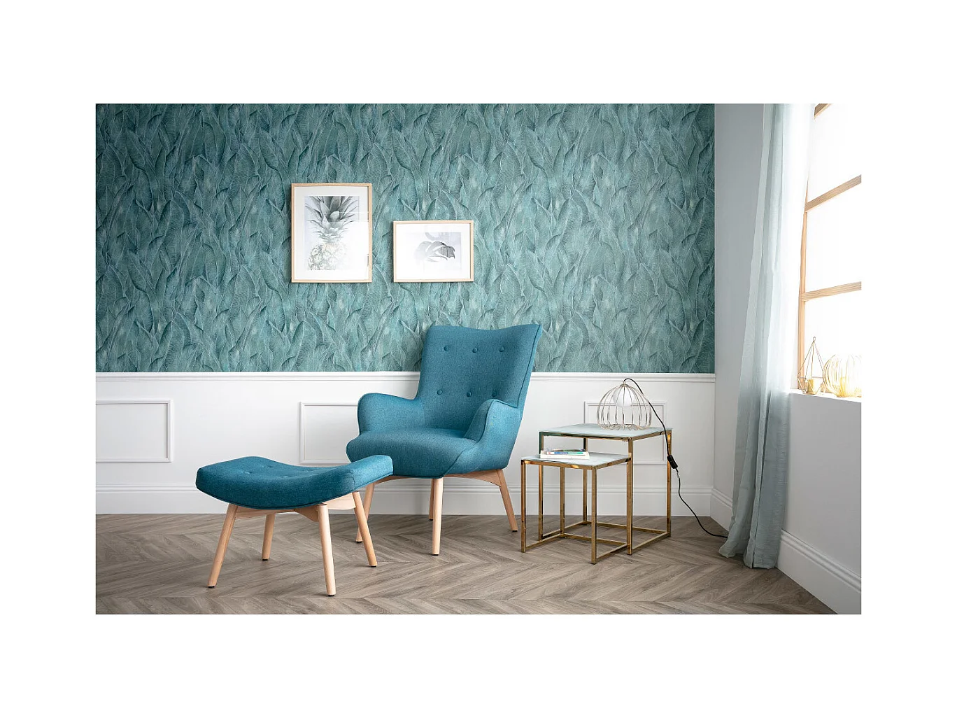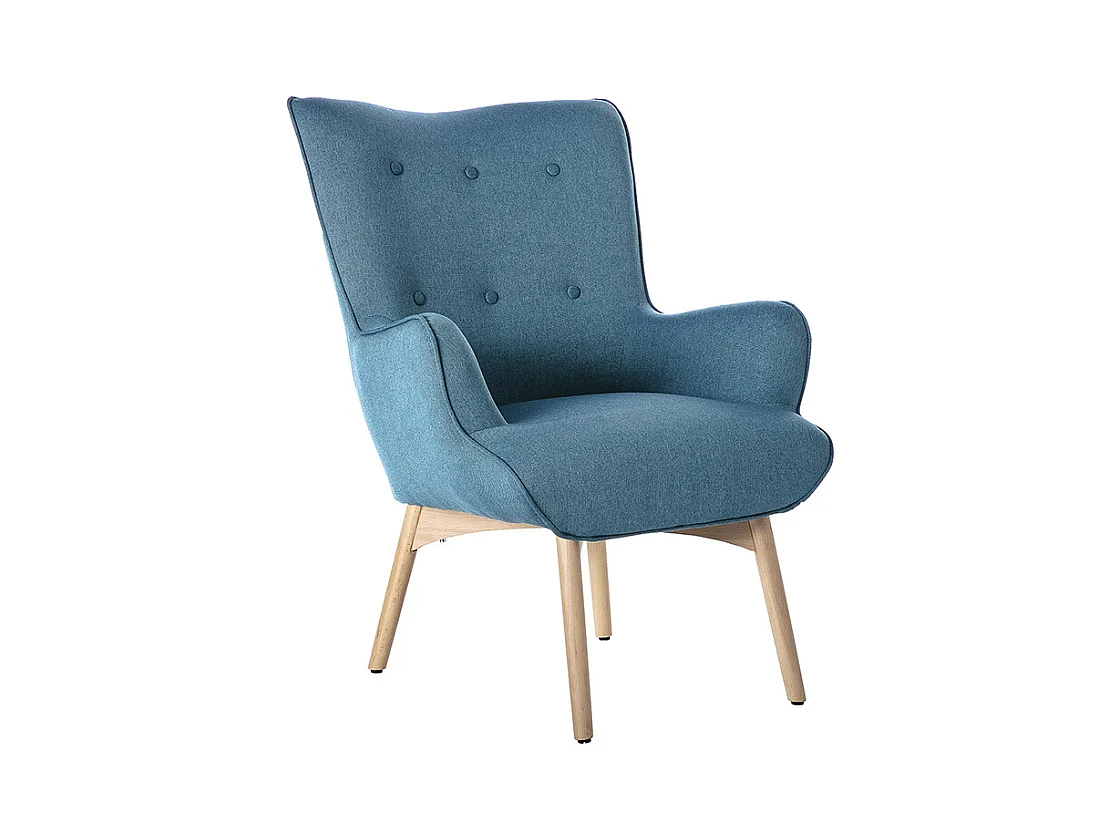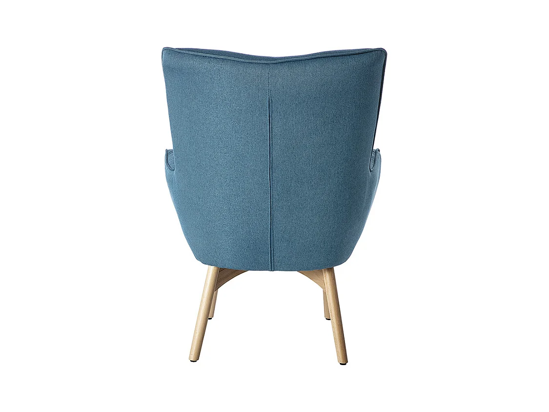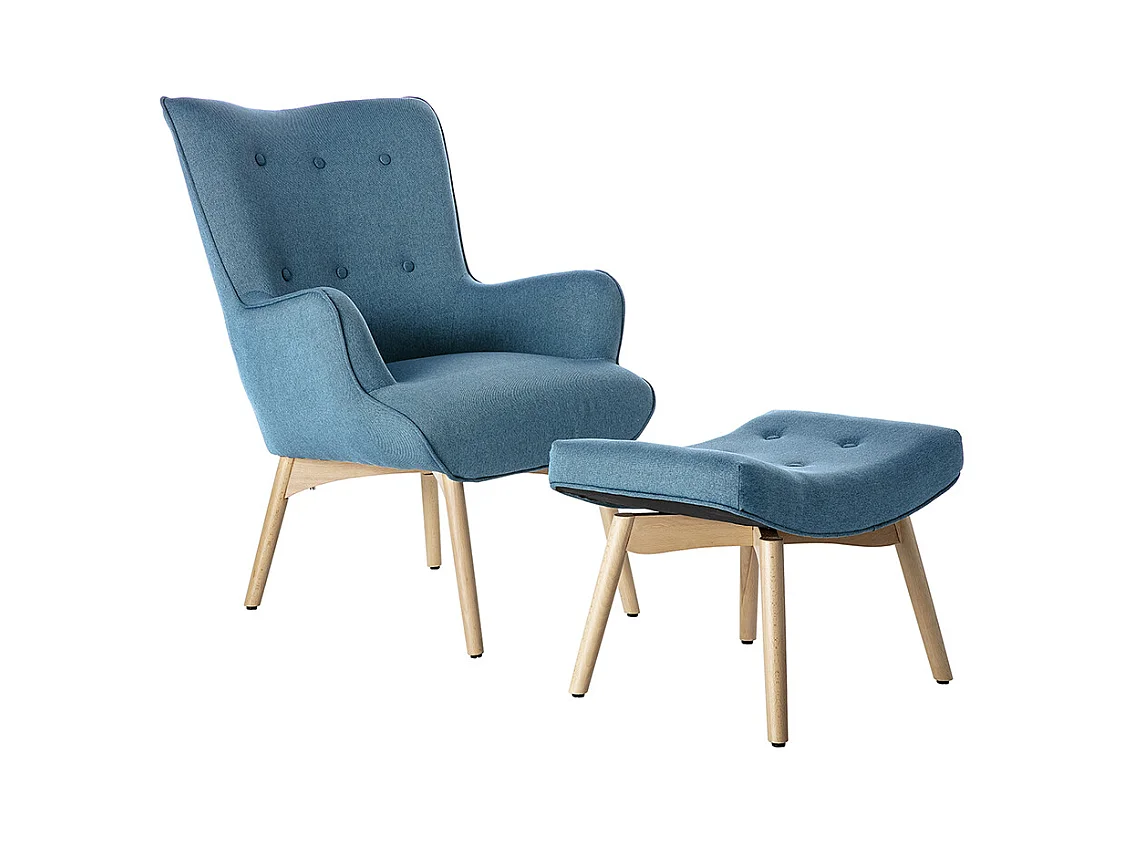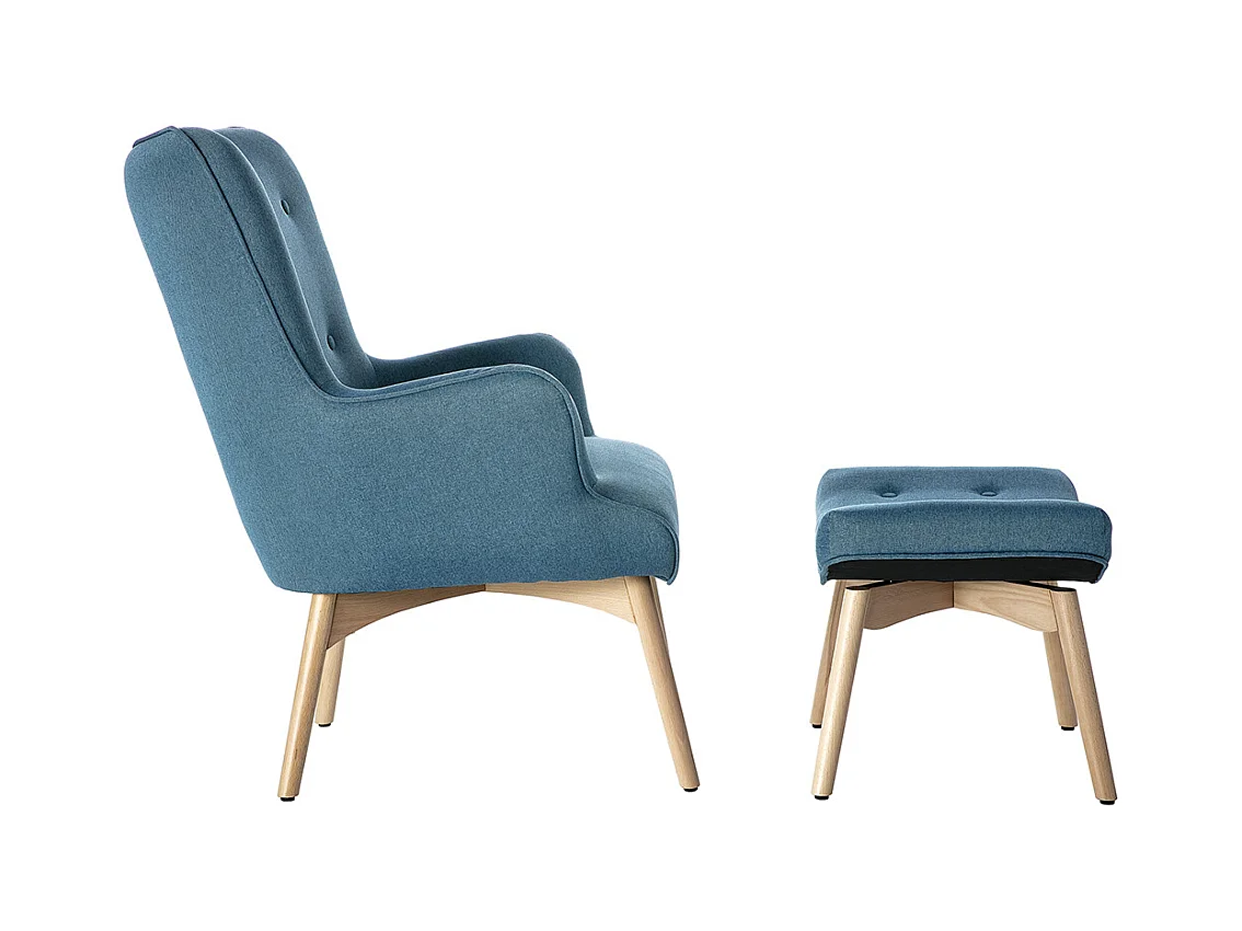 Fauteuil avec repose-pieds scandinave en tissu bleu canard et bois clair BRISTOL