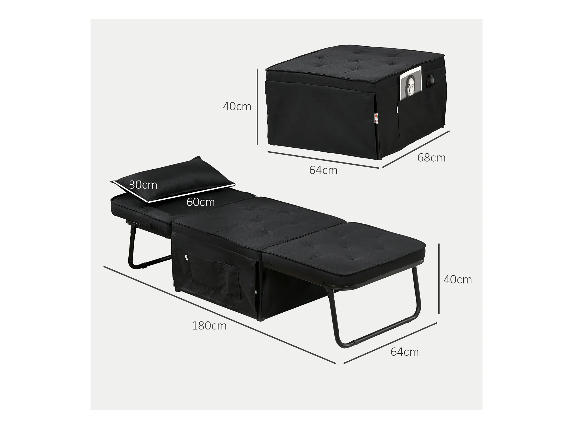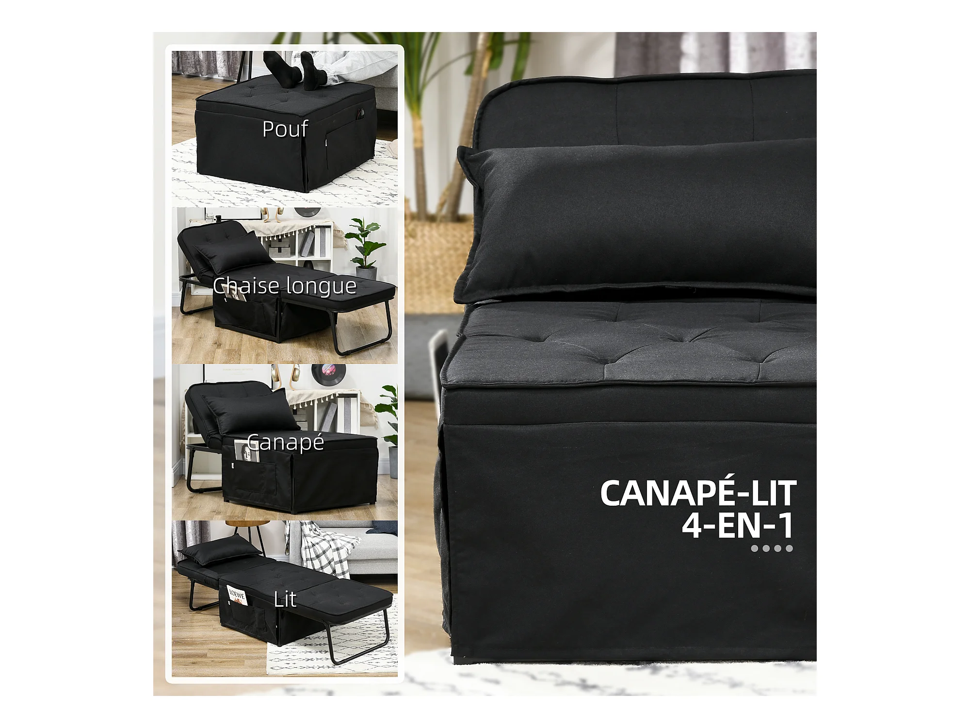 Fauteuil chaise longue lit pouf 4 en 1 dossier inclinable 5 niveaux repose-pied rabattable châssis acier noir tissu noir