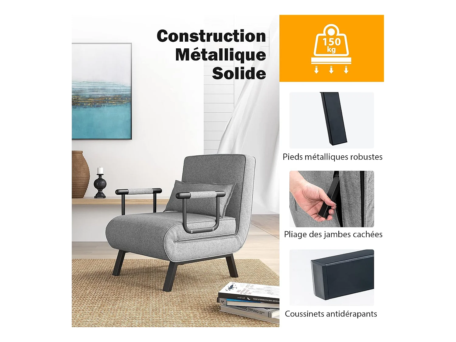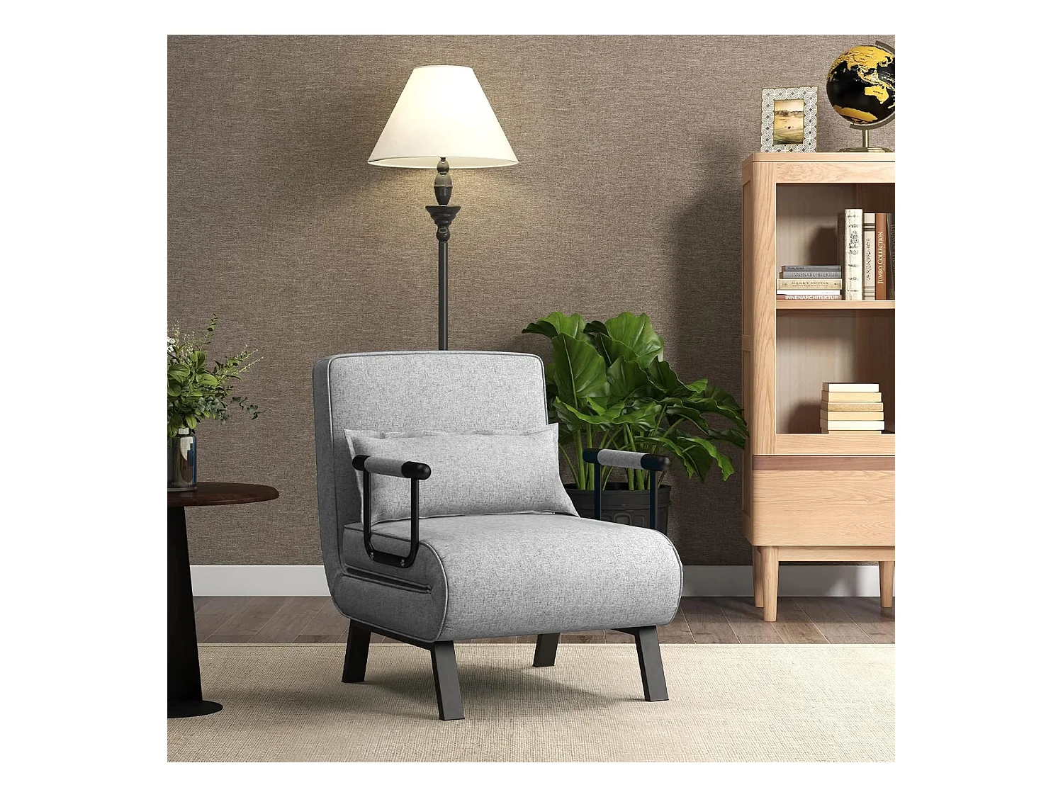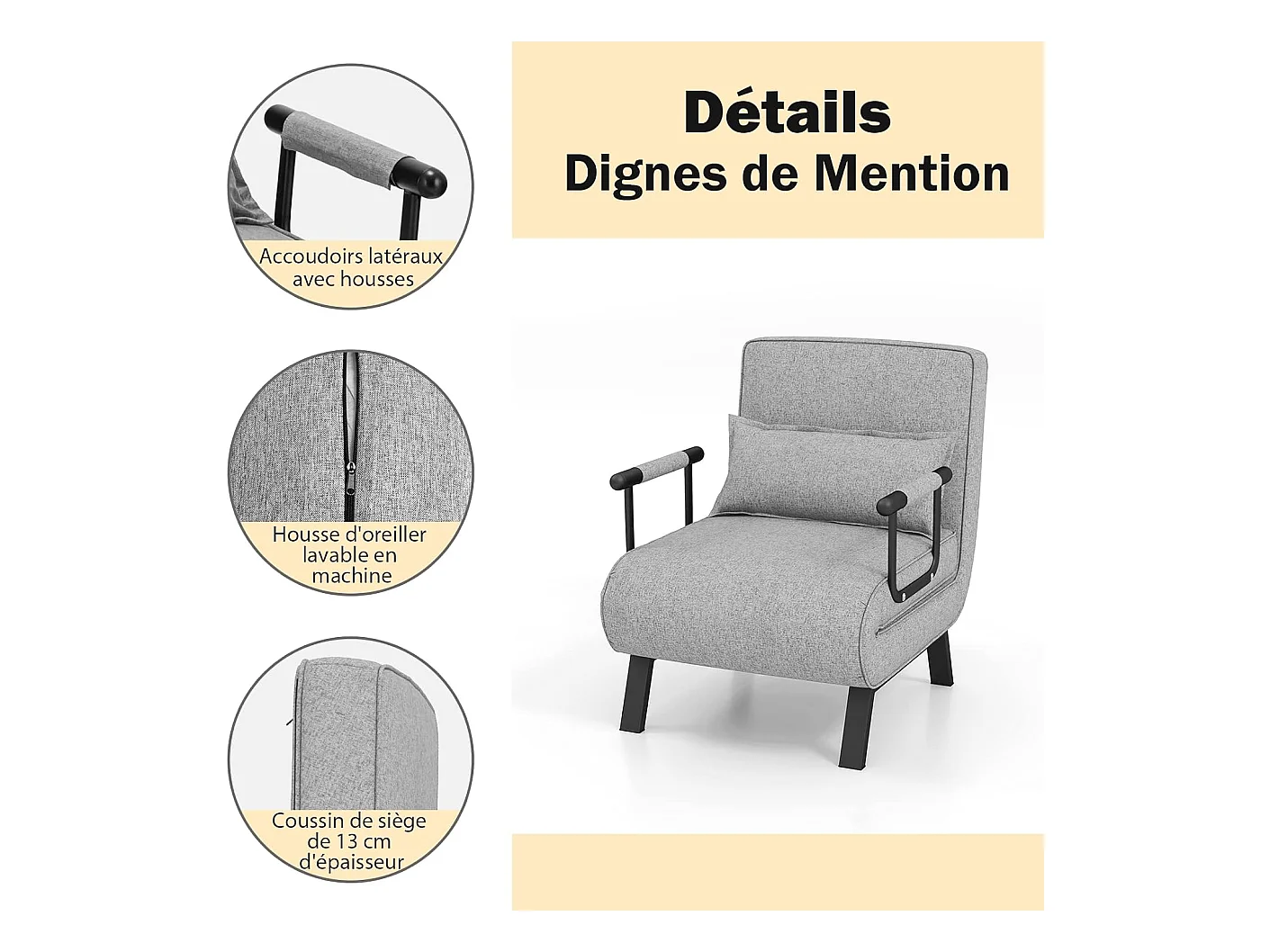 Fauteuil Convertible 1 Place, Chauffeuse 4-en-1 Dossier Réglable 6 Position, Oreiller, Siège Rembourré, Accoudoirs, Cadre Métal, Canapé-Lit Pliant, Gris clair