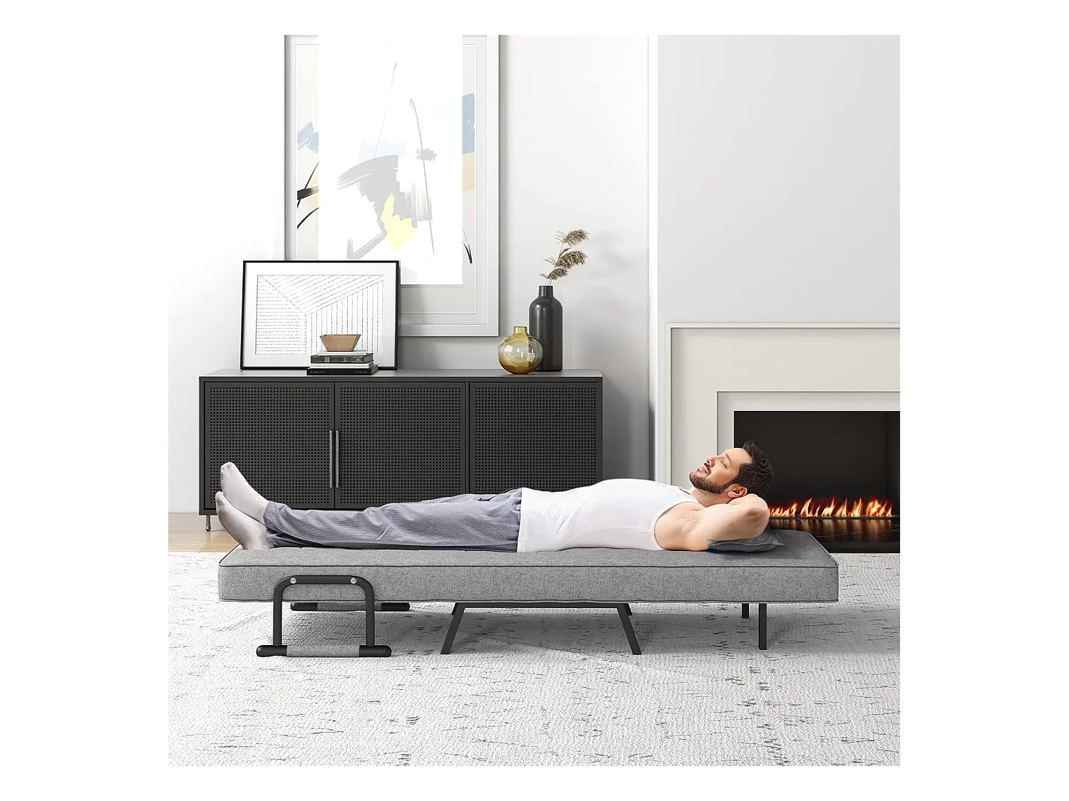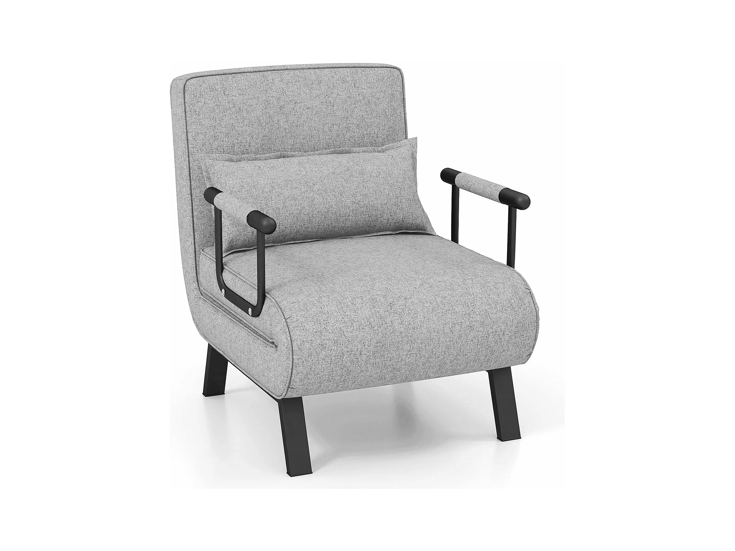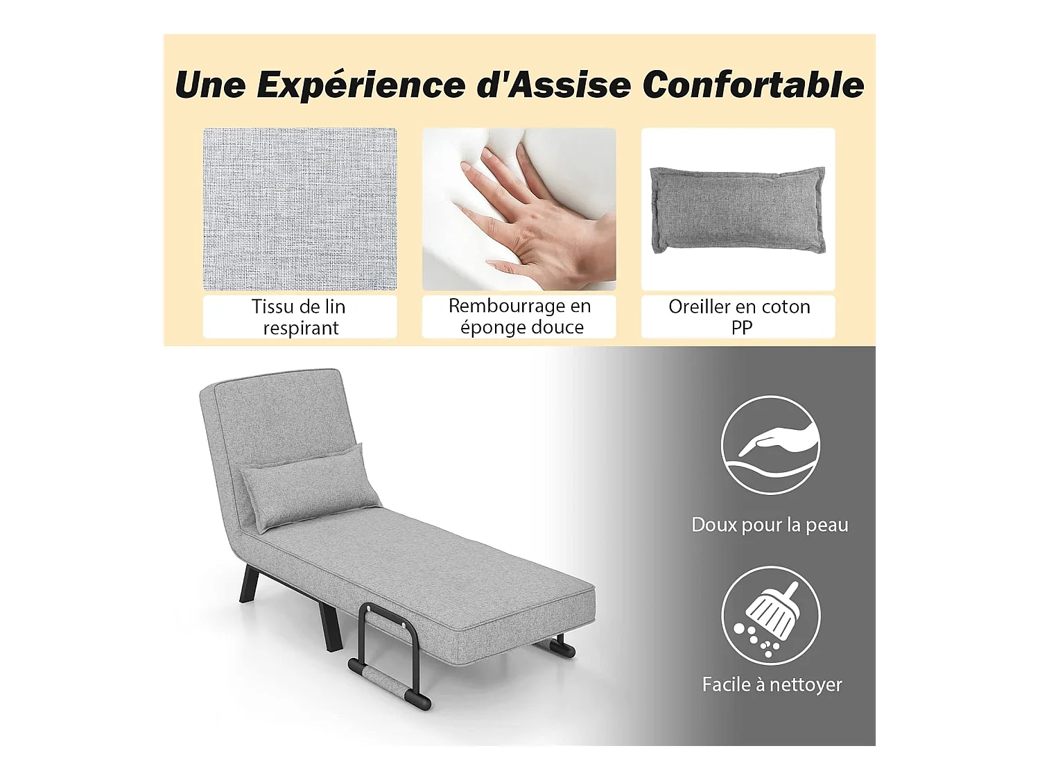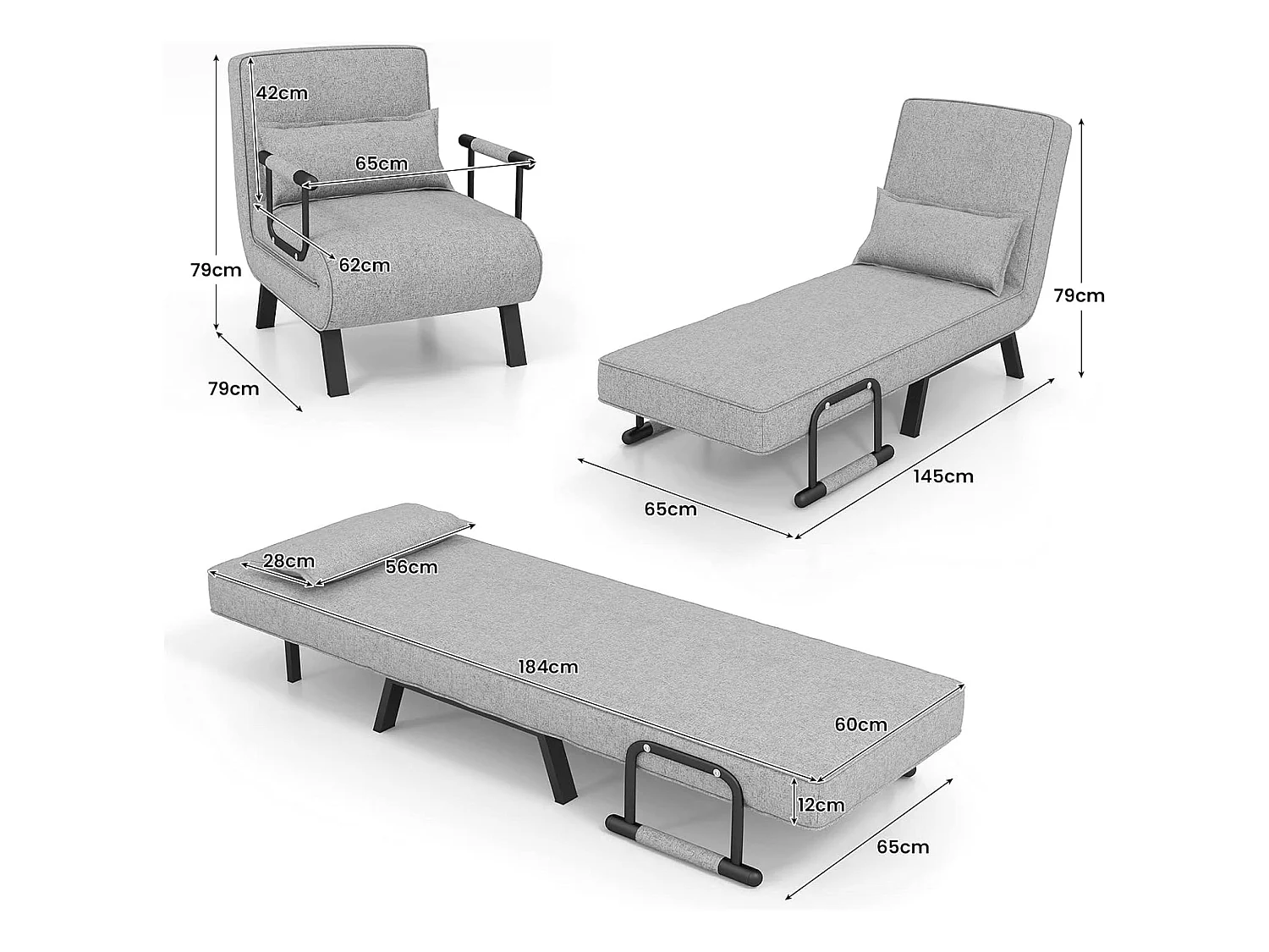 Fauteuil Convertible 1 Place, Chauffeuse 4-en-1 Dossier Réglable 6 Position, Oreiller, Siège Rembourré, Accoudoirs, Cadre Métal, Canapé-Lit Pliant, Gris clair