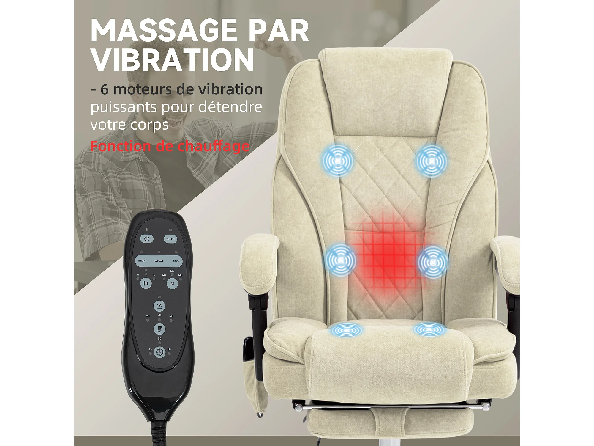 Fauteuil de bureau manager massant chauffant inclinable réglable télécommande repose-pieds rétractable velours beige sable