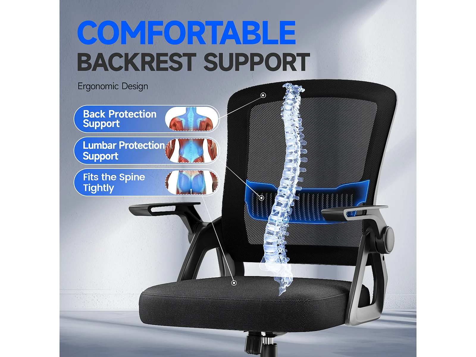 Fauteuil de bureau pivotant avec accoudoirs relevables à 90° et soutien lombaire, pour la maison ou le bureau