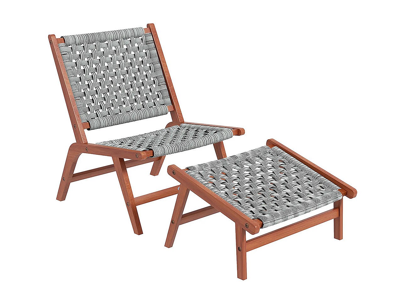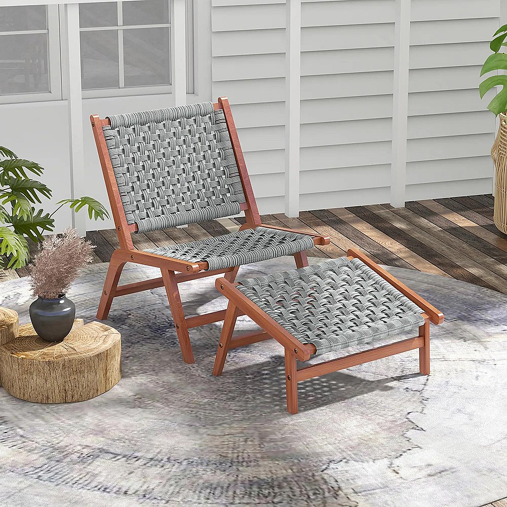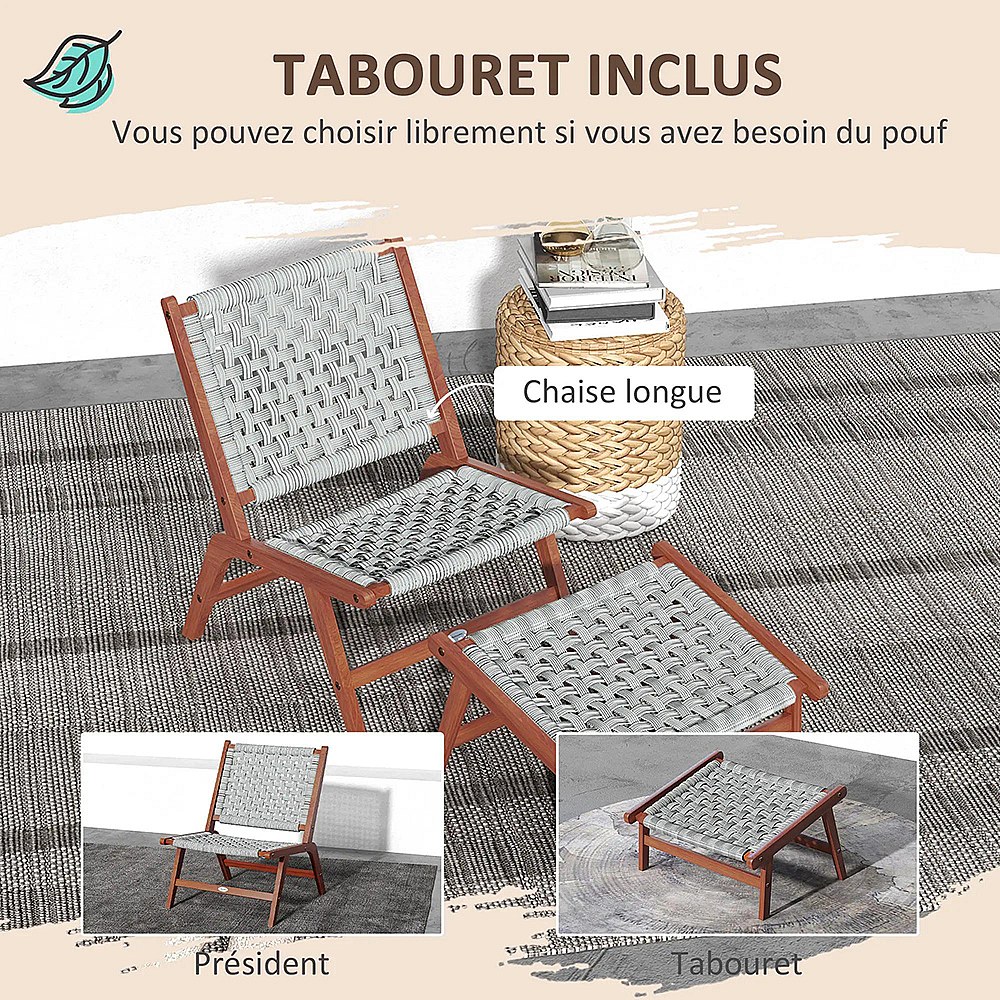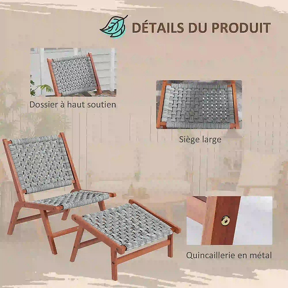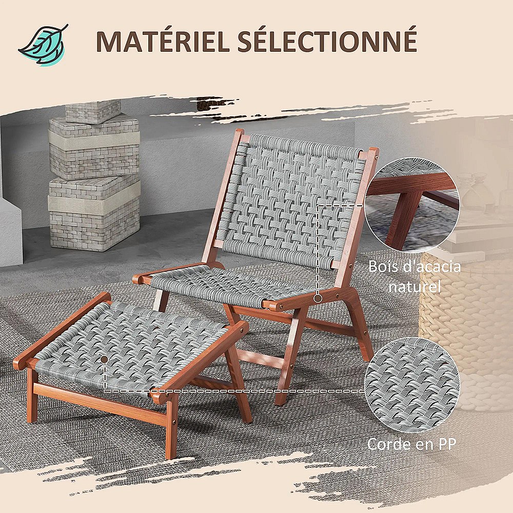 Fauteuil de jardin avec repose-pieds - chaise relax en bois d'acacia et corde résine tressée - naturel gris