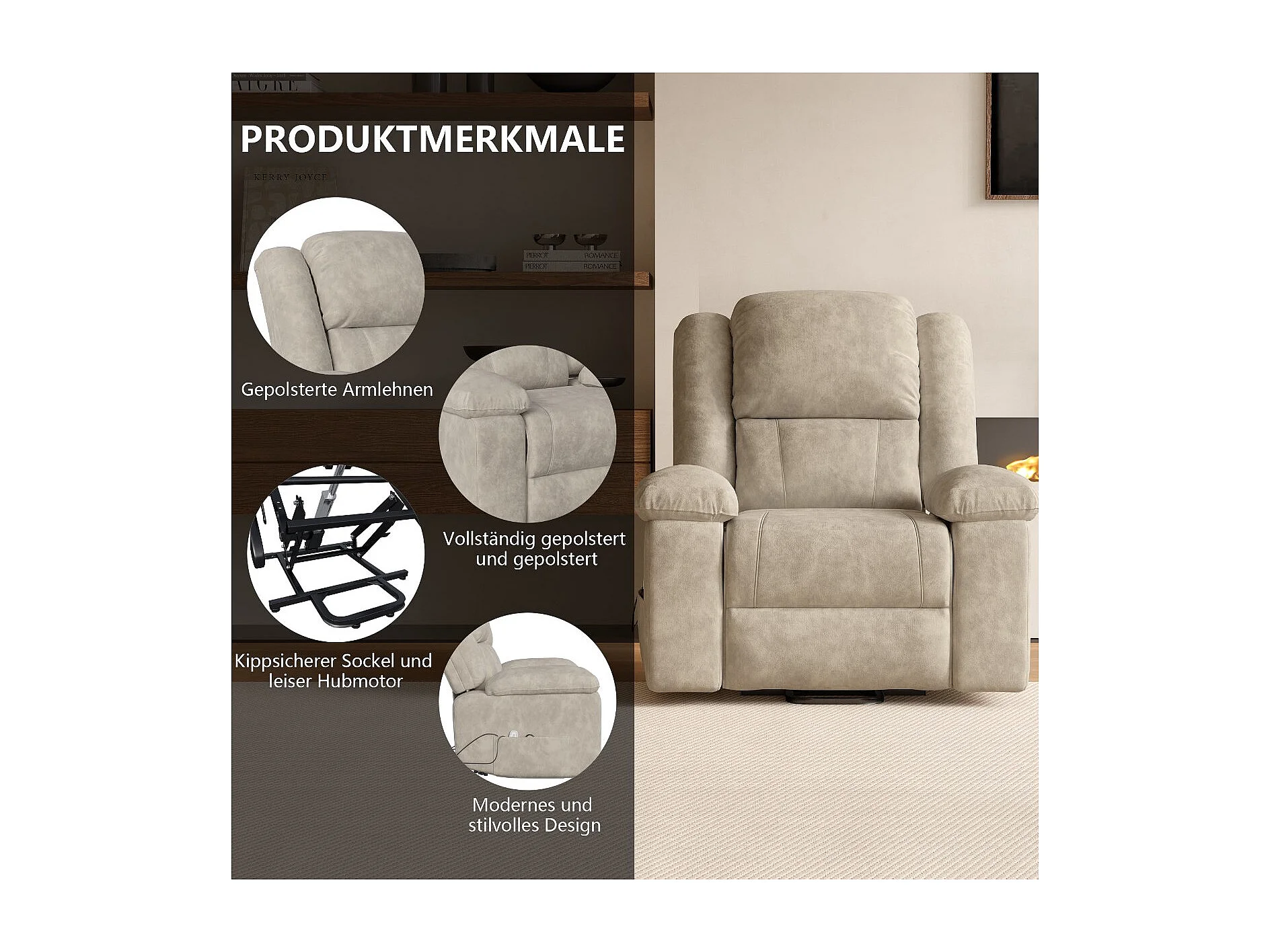 Fauteuil de massage électrique avec accoudoirs rembourrés, fauteuil inclinable, en tissu aspect daim, disponible en noir ou marron.