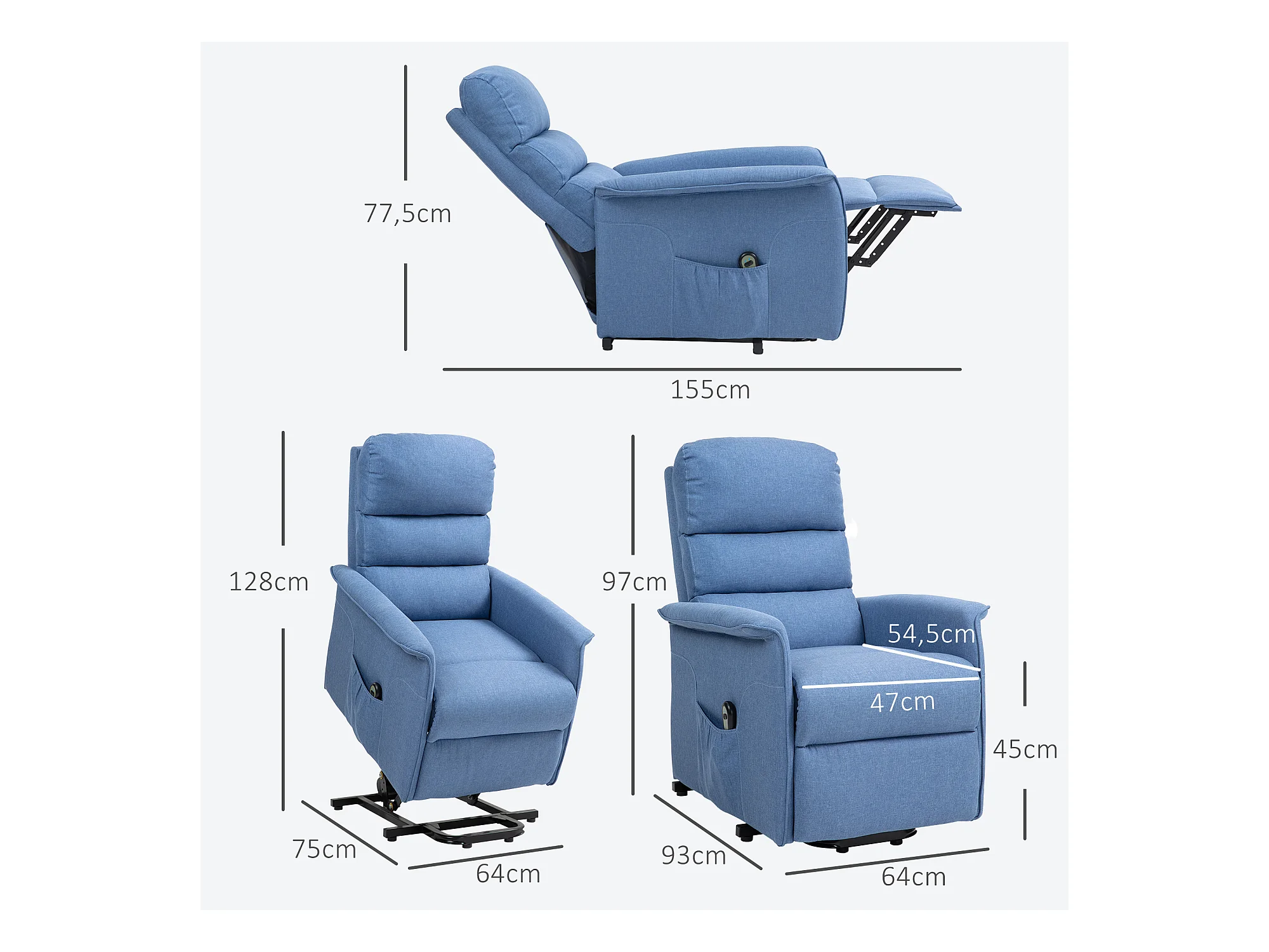 Fauteuil de relaxation électrique télécommande - fauteuil releveur inclinable, repose-pied ajustable - tissu polyester aspect lin bleu