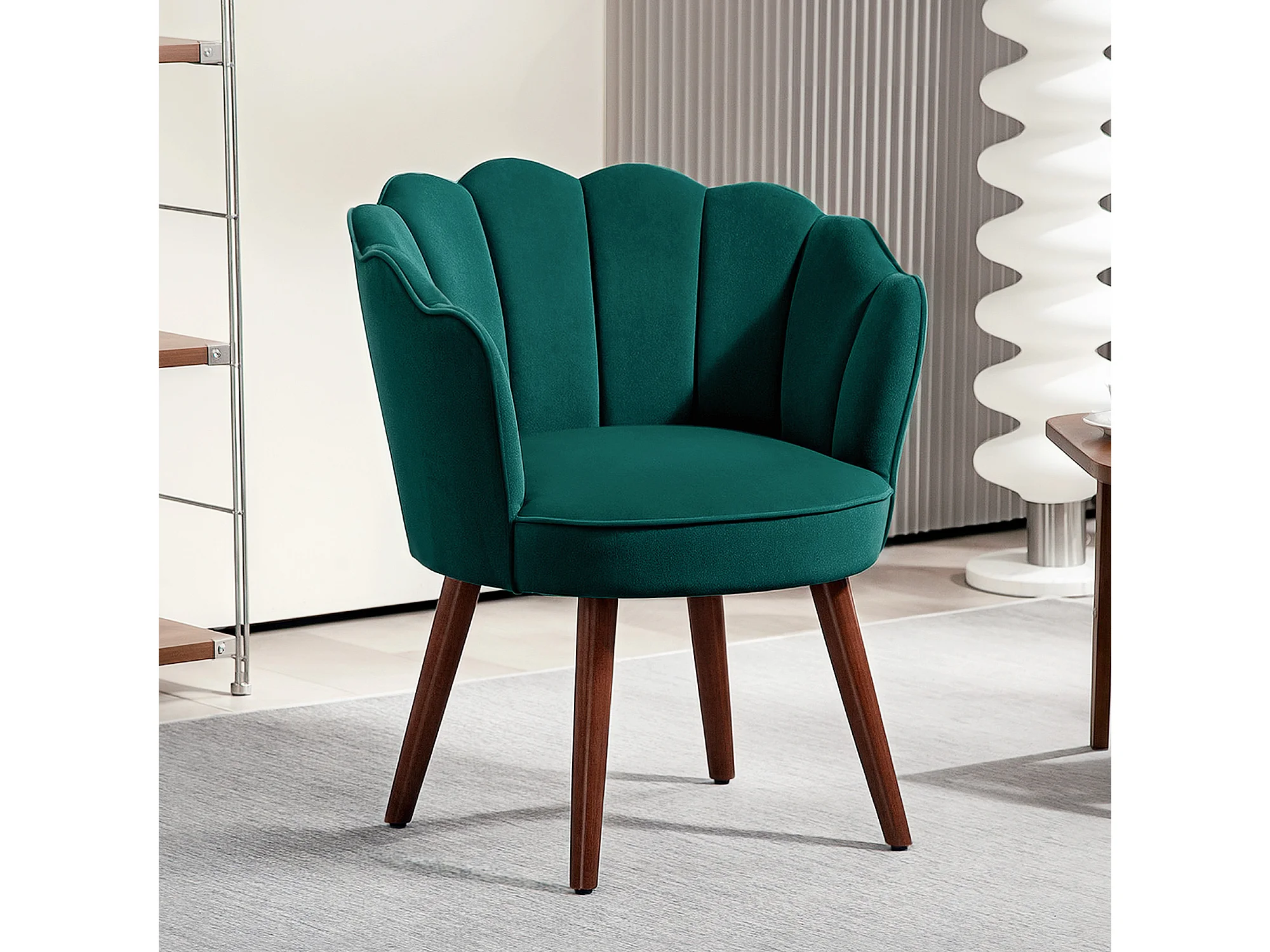 Fauteuil design coquillage piètement effilé bois d'hévéa dossier enveloppant strié aspect velours vert sapin