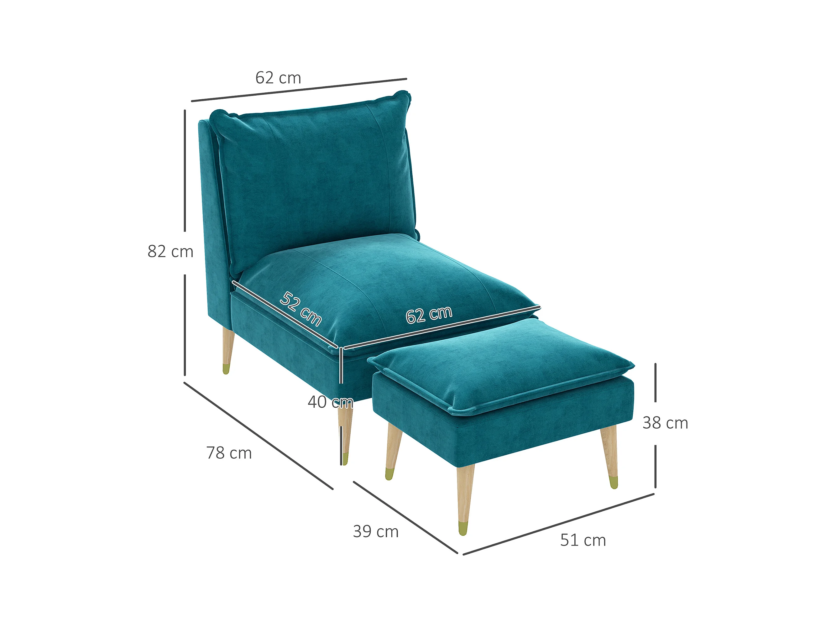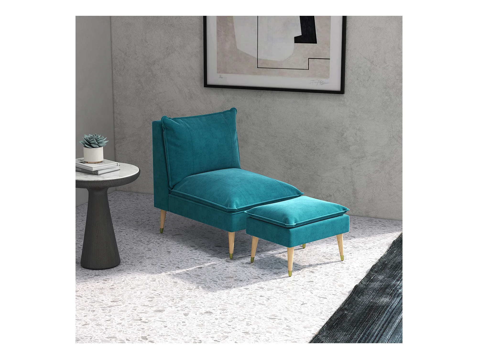 Fauteuil design scandinave grand confort - repose-pied inclus - piètement effilé incliné bois hévéa velours turquoise