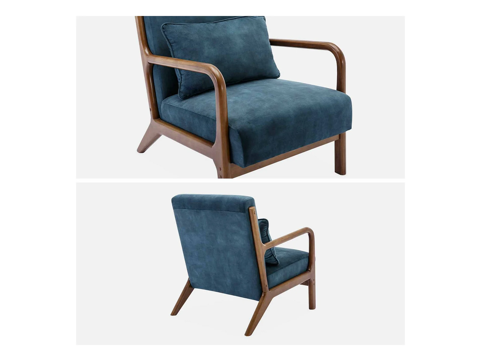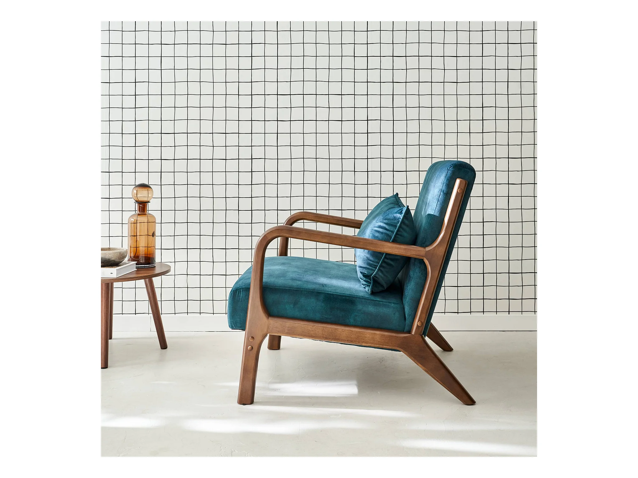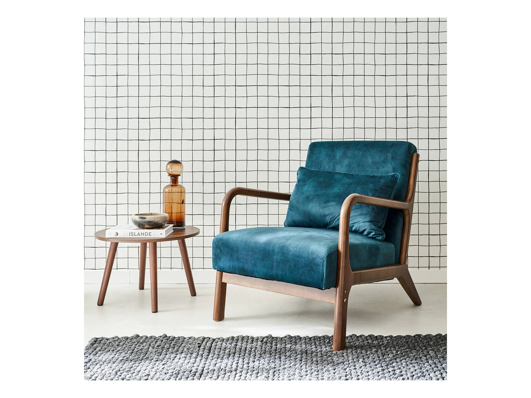 Fauteuil en velours bleu pétrole. pieds bois d'hévéa teinté noyer clair. 1 place droit fixe. pieds compas scandinave