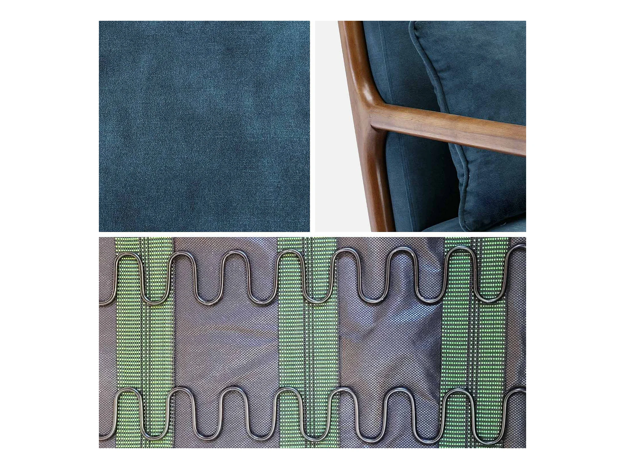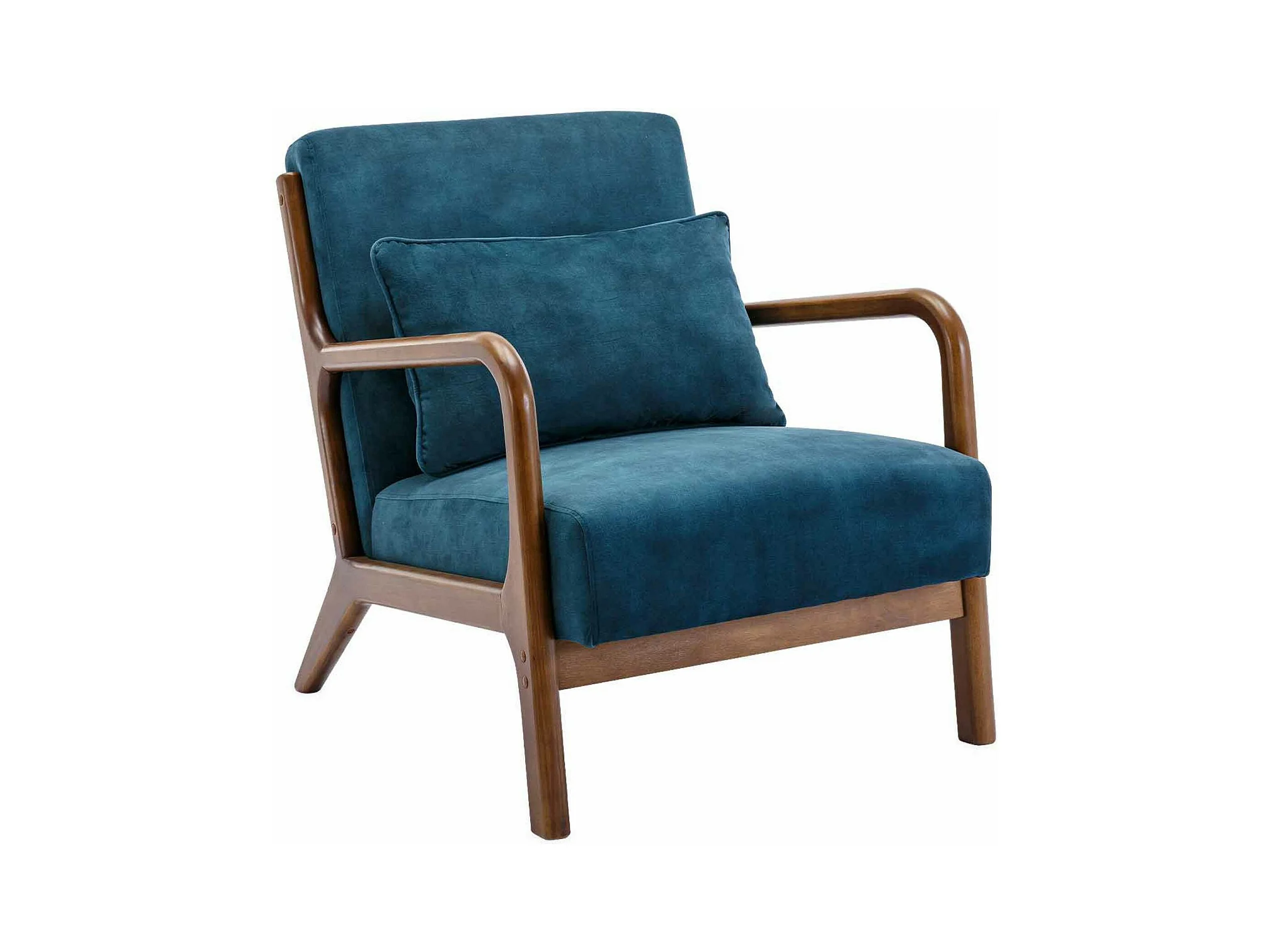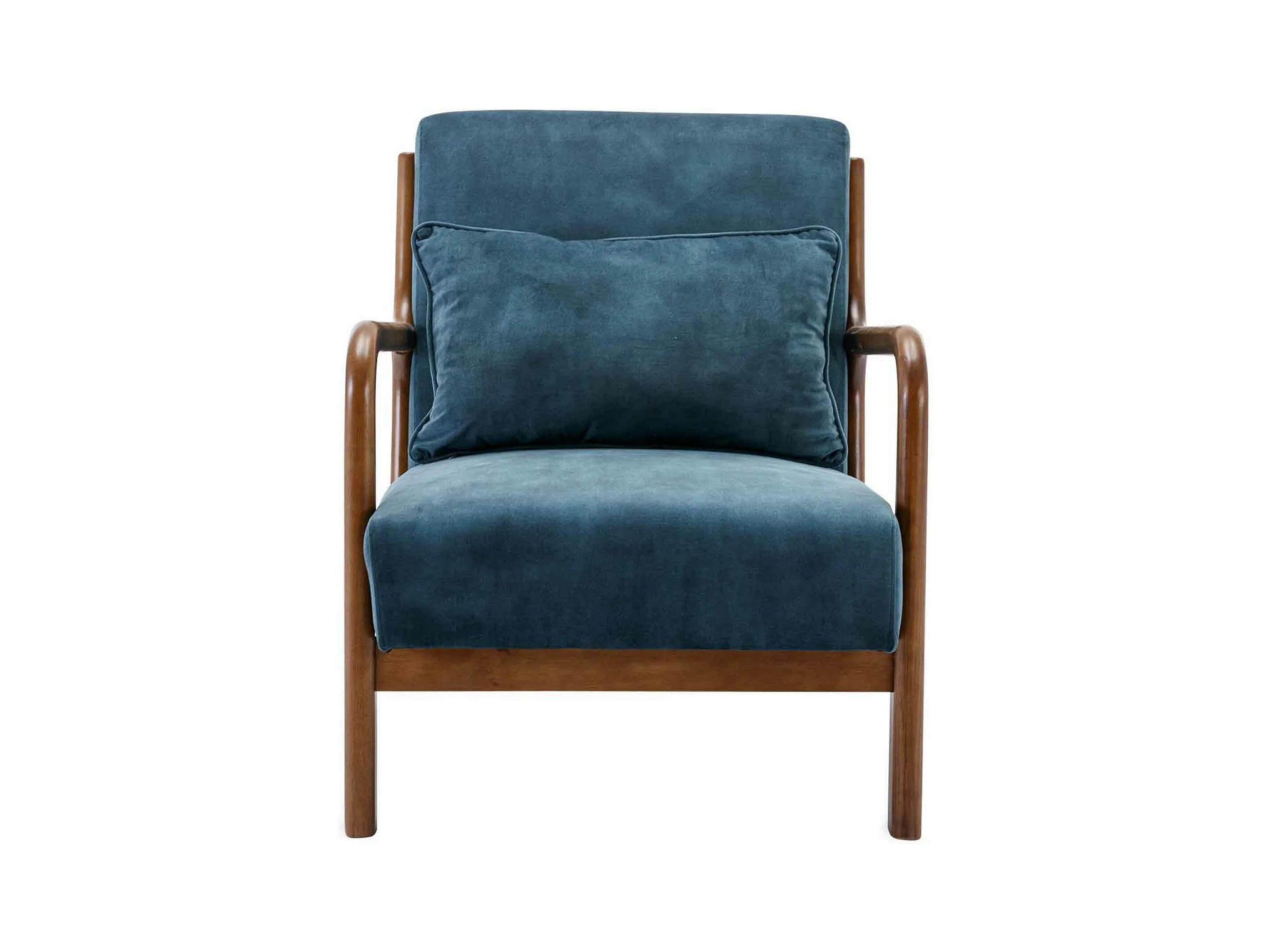 Fauteuil en velours bleu pétrole. pieds bois d'hévéa teinté noyer clair. 1 place droit fixe. pieds compas scandinave