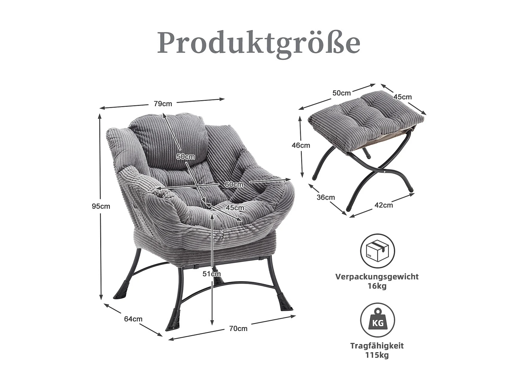 Fauteuil en velours côtelé gris anthracite - Repose-pieds pratique - Poche latérale pour téléphone - Style moelleux et spacieux - Parfait pour salon ou chambre