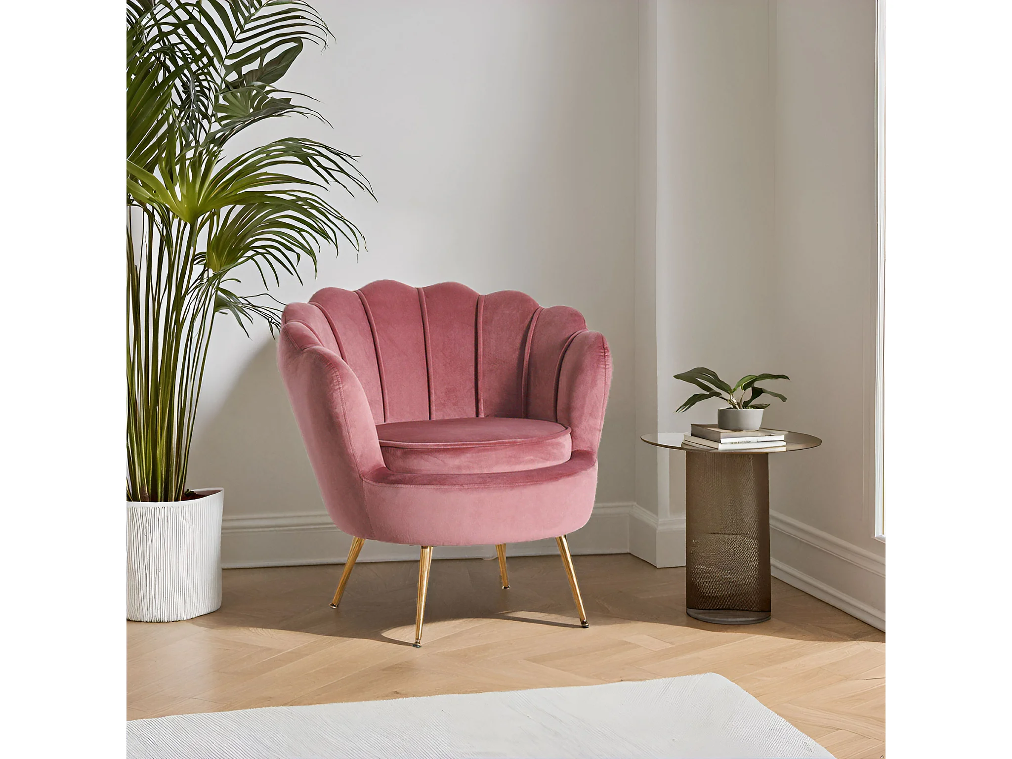 Fauteuil en velours d’intérieur en forme de coquillage, design raffiné et élégant,avec pieds en métal,idéal pour la chambre ou le salon–Perla–Rose/Or
