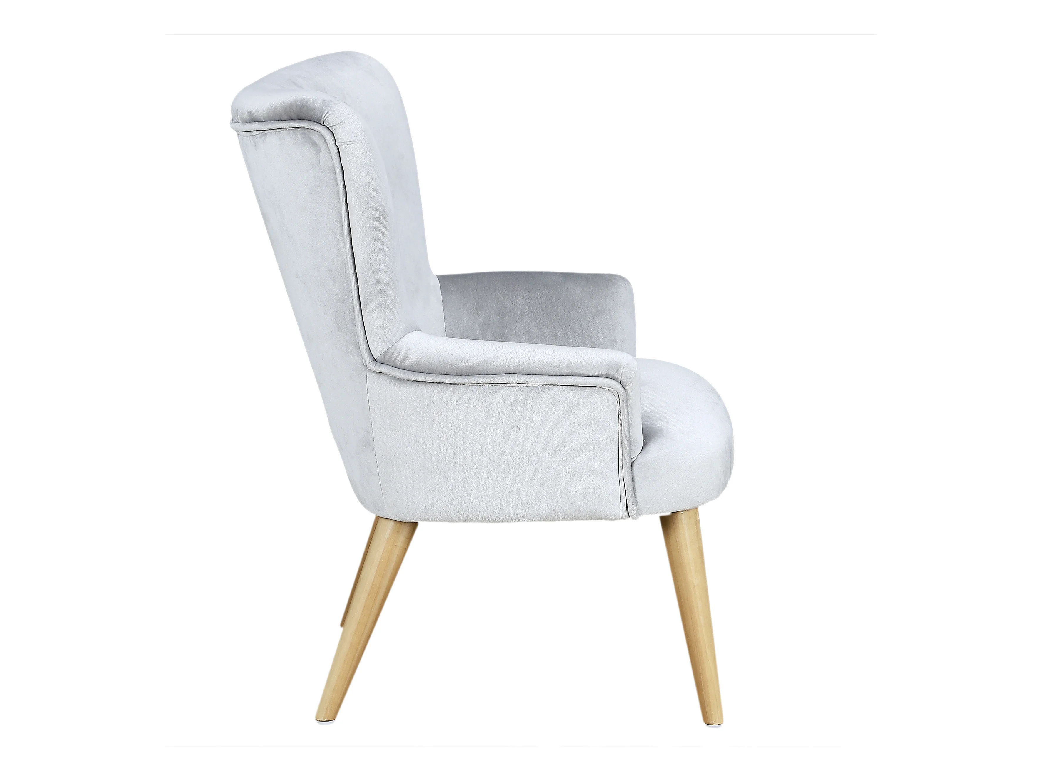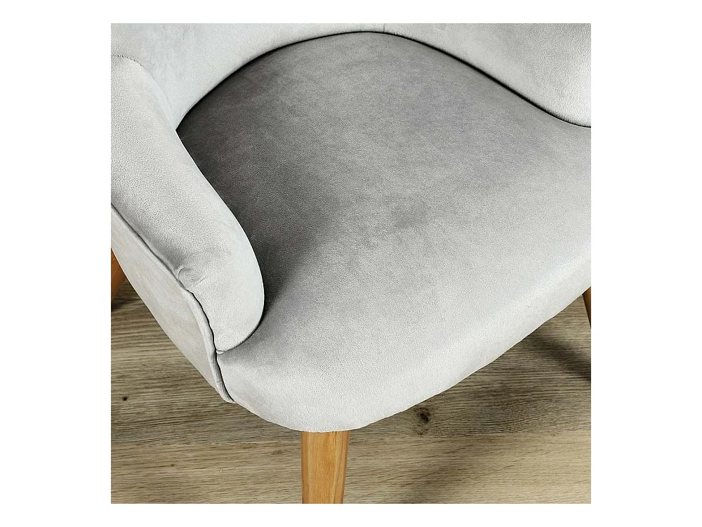 Fauteuil salon design scandinave - dossier accoudoirs enveloppant - piètement bois hévéa velours effet capitonné gris
