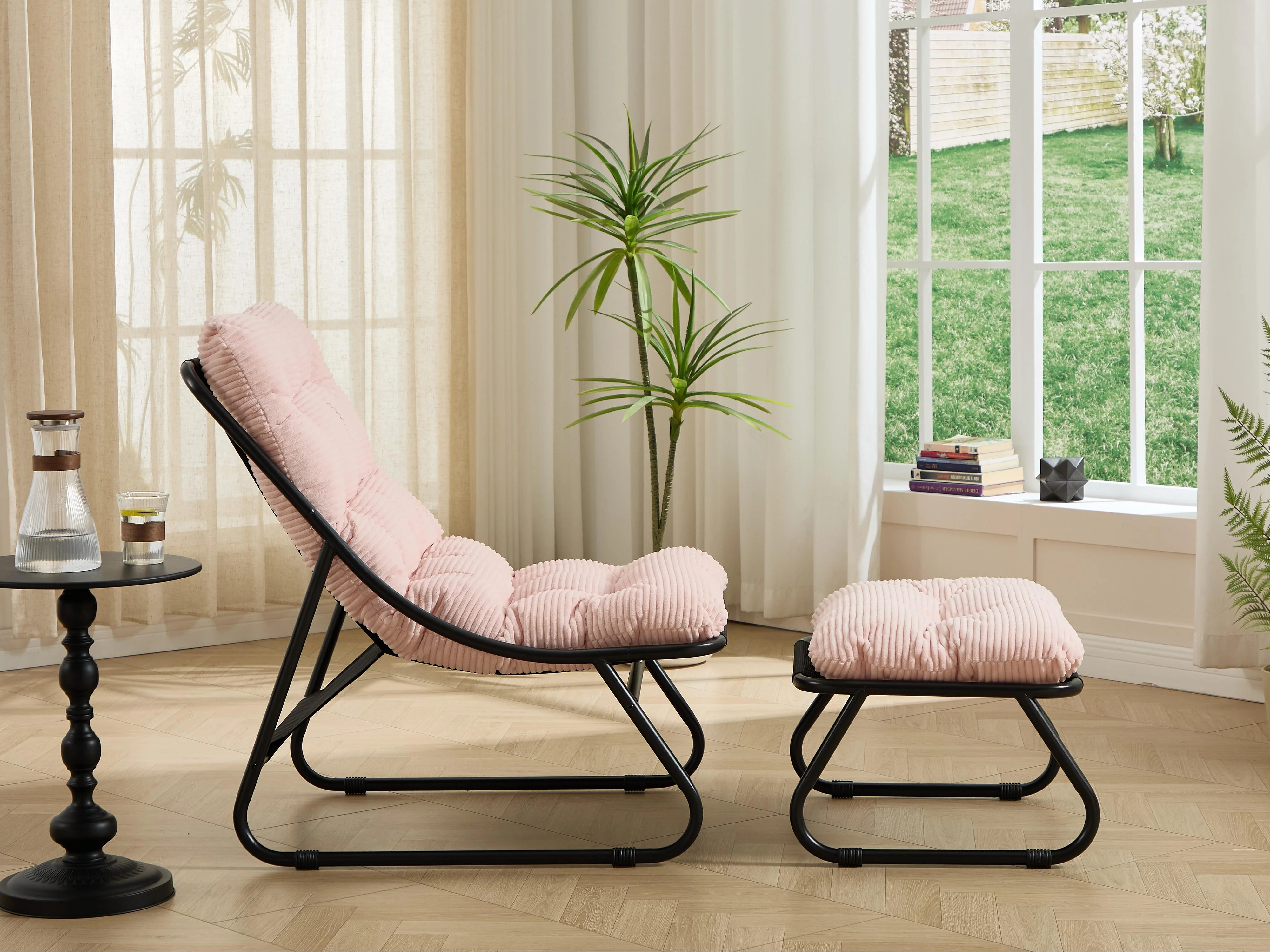 Fauteuil extérieur en acier avec coussin, pouf offert, chaise de jardin moderne pour terrasse et balcon