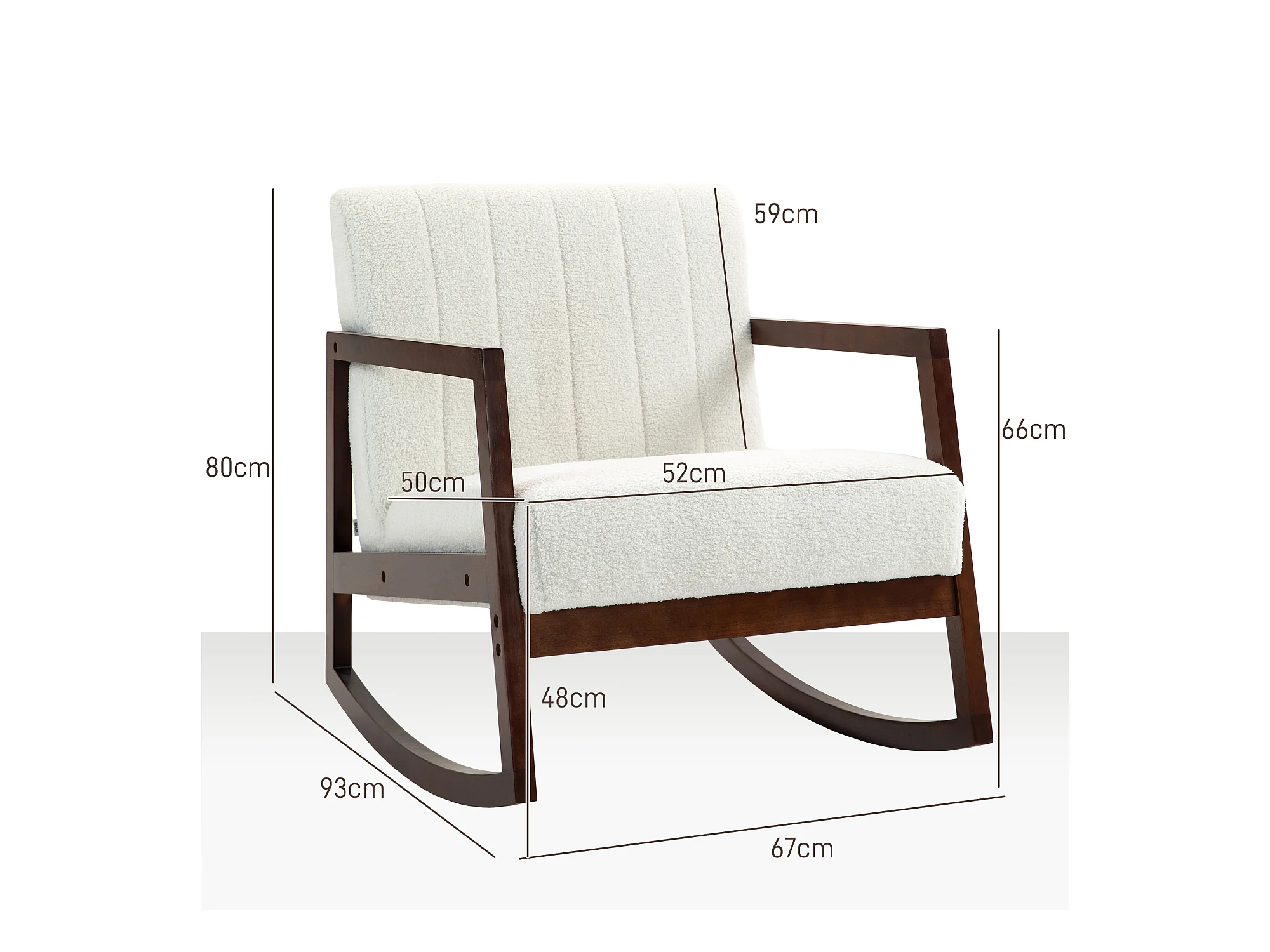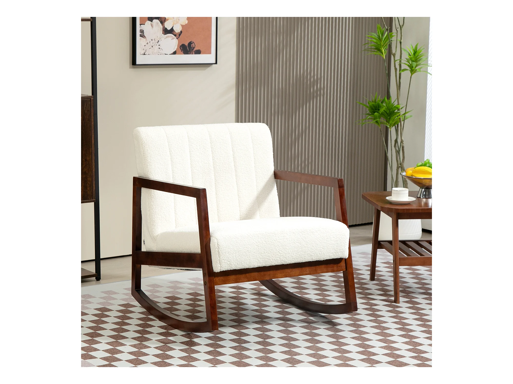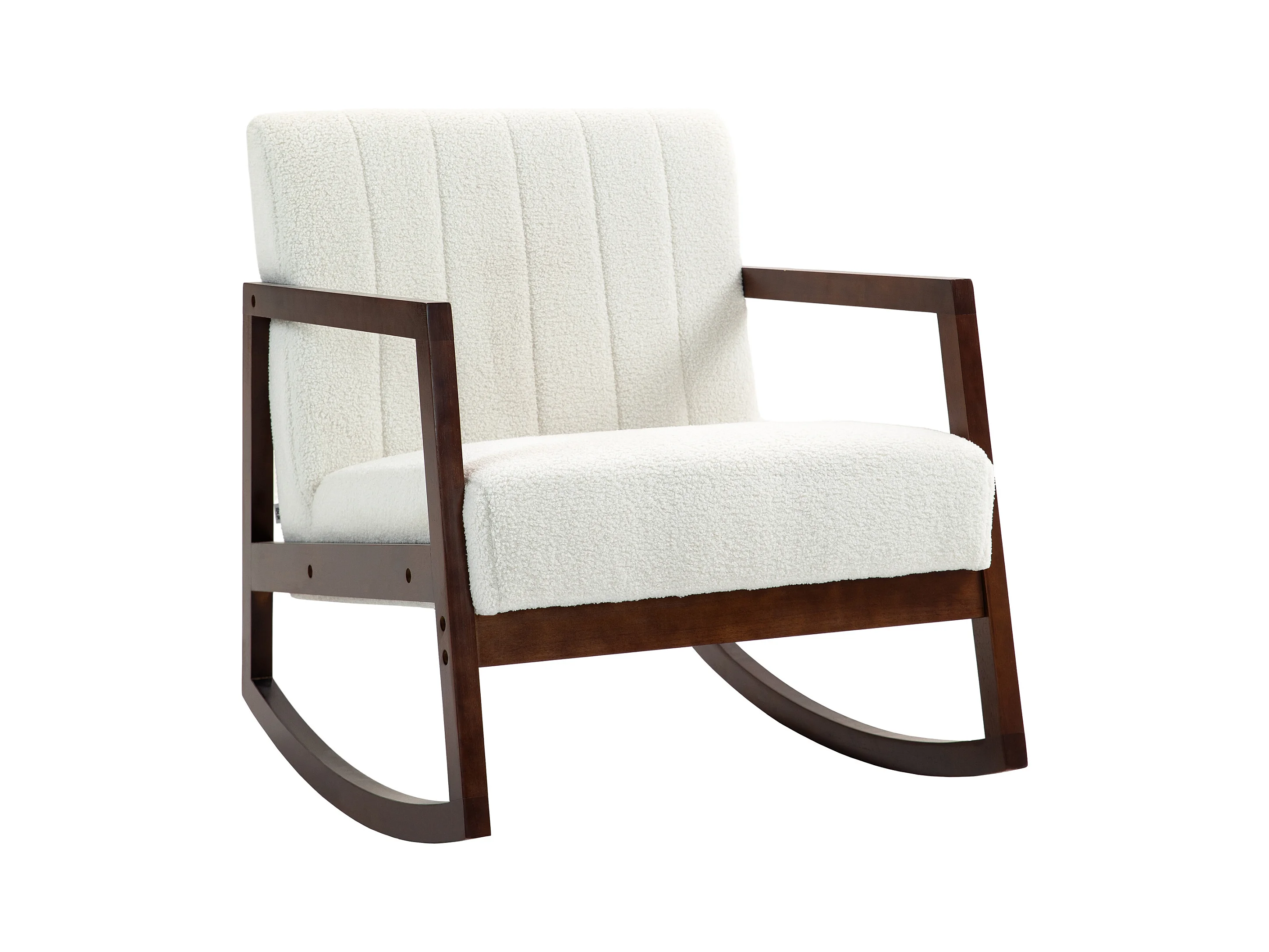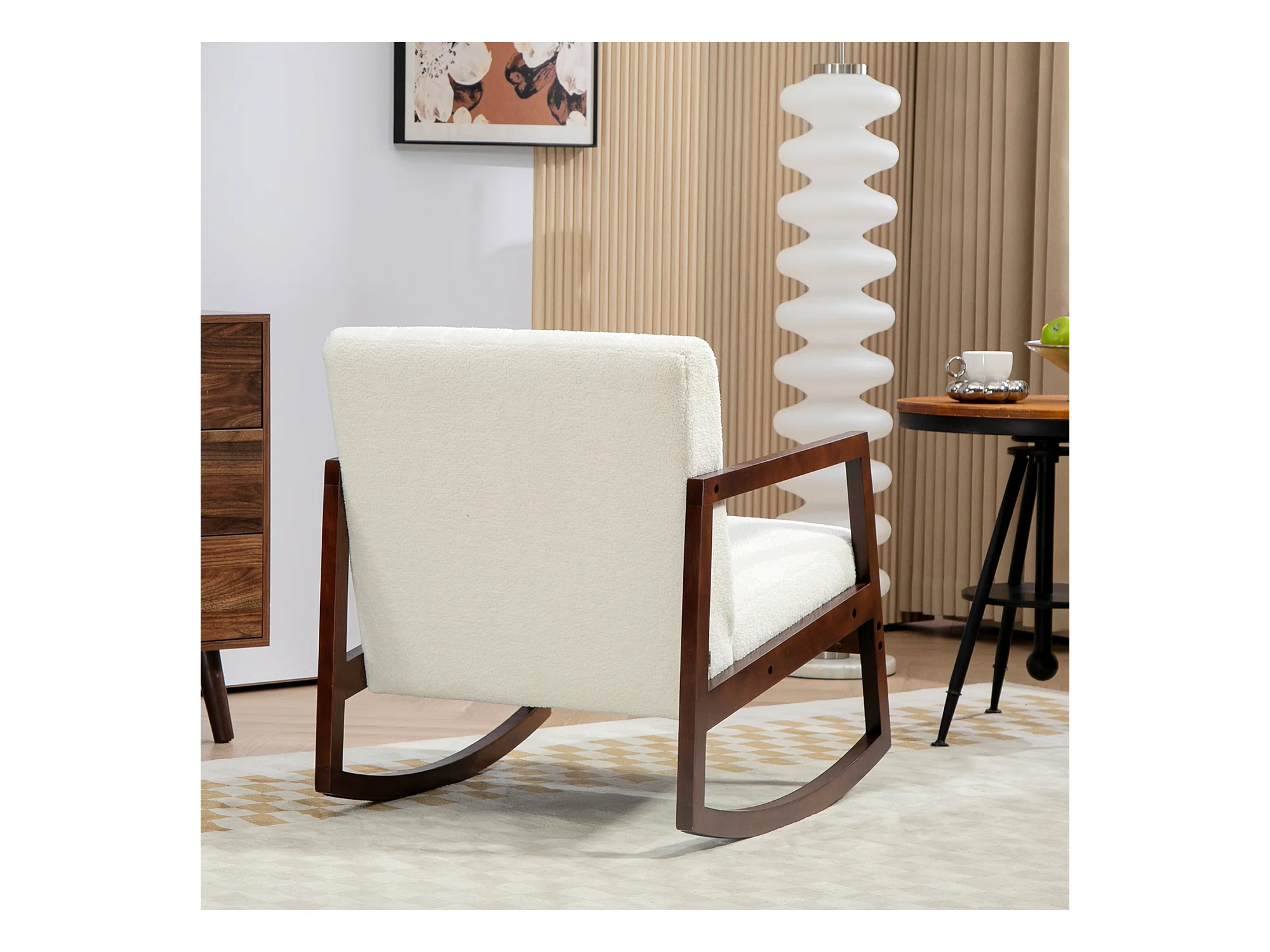 Fauteuil lounge à bascule - assise profonde, dossier incliné - accoudoirs, structure bois hévéa - revêtement effet laine bouclée crème