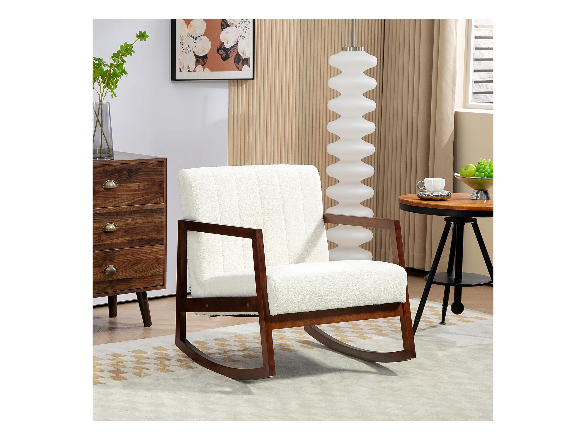Fauteuil à bascule rocking chair design - structure acier piètement bois tissu effet laine bouclé beige