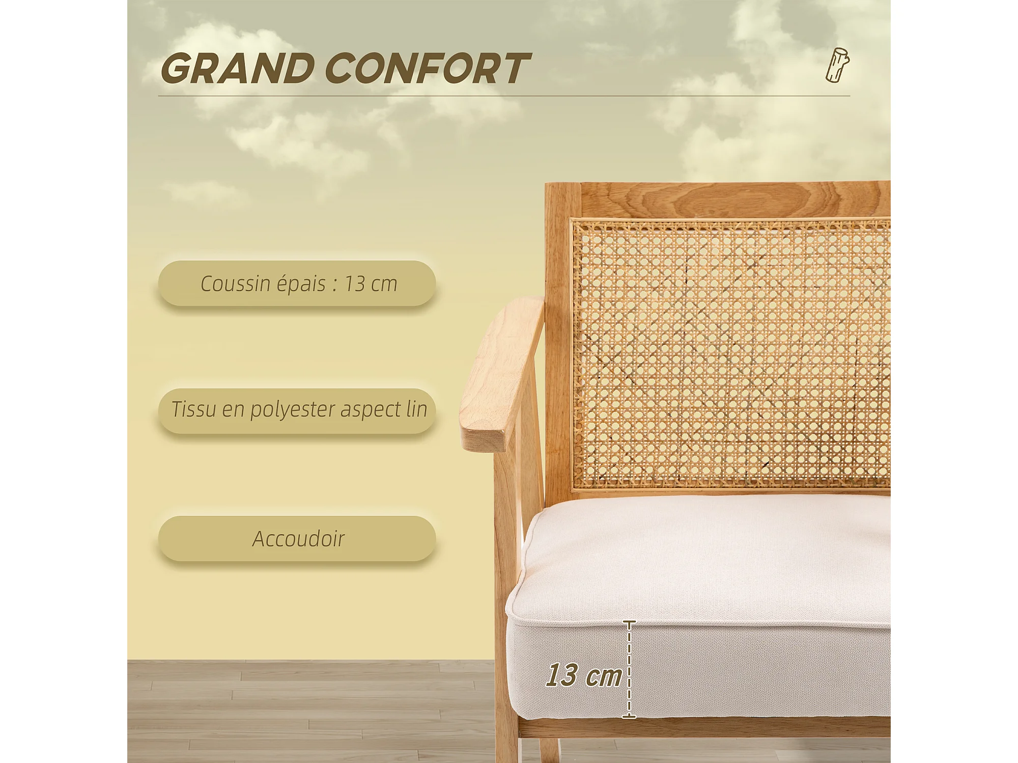 Fauteuil lounge avec coussin - dossier en cannage - assise profonde - accoudoirs - structure bois hévéa - aspect lin beige