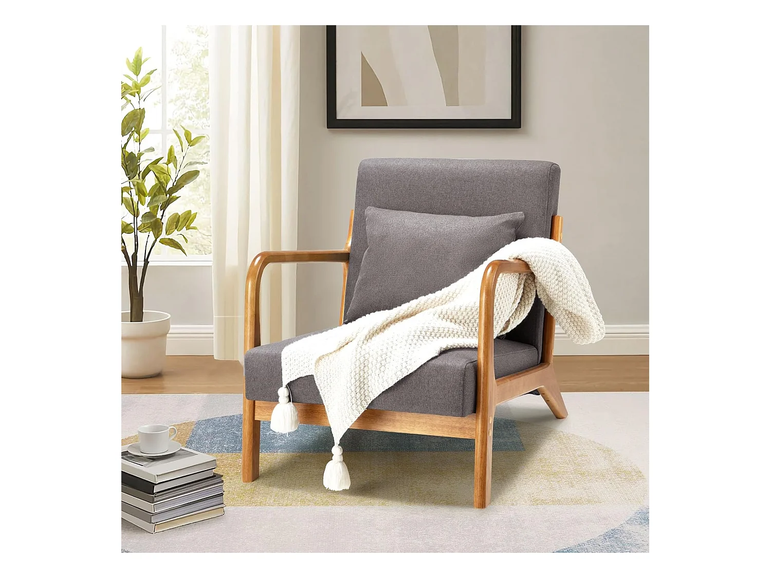Fauteuil Lounge en Lin Gris - Structure Bois Hévéa - Assise Profonde et Accoudoirs