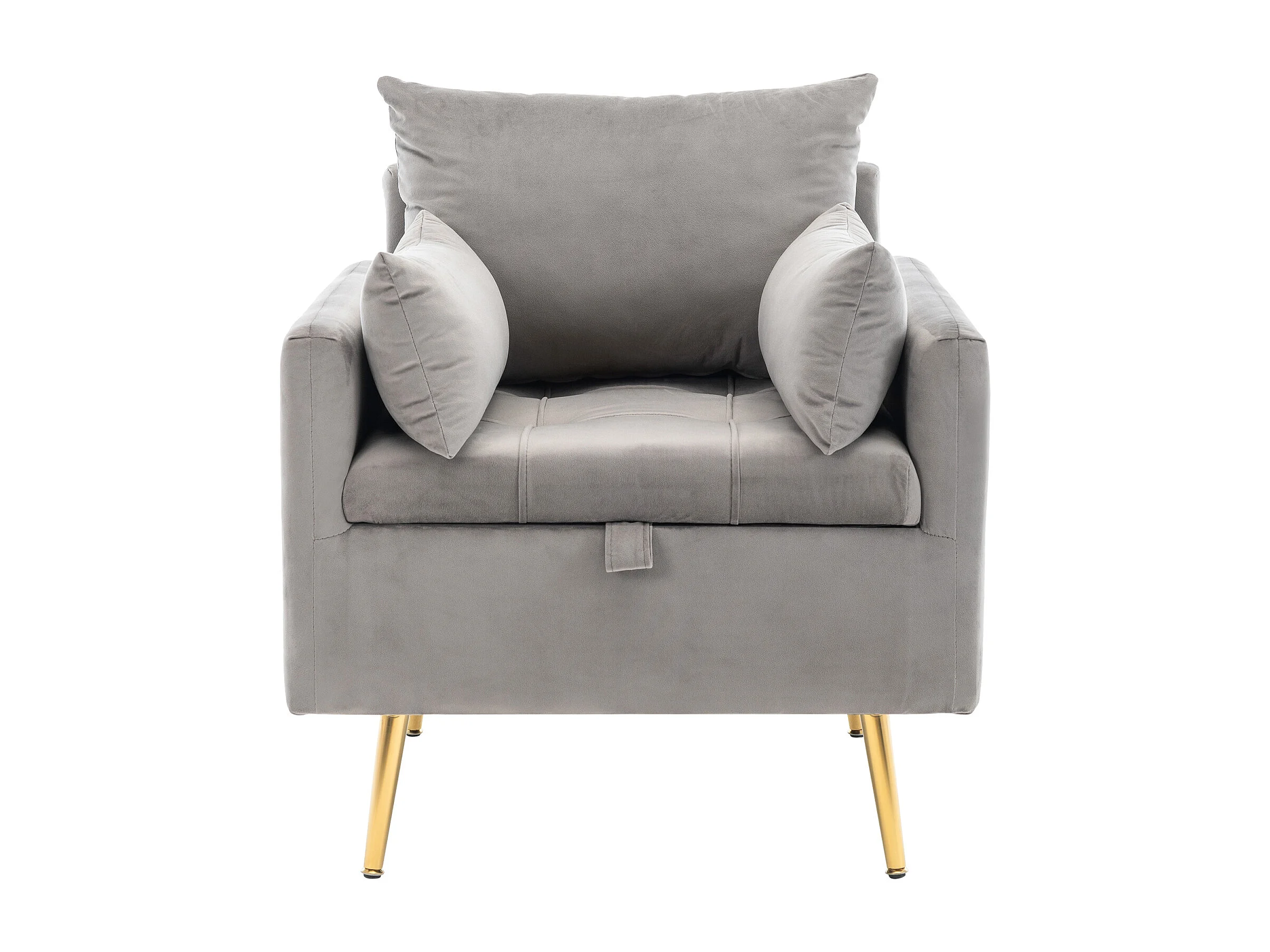 Fauteuil lounge en velours avec pouf de rangement, coussin décoratif et pieds en métal doré – Style minimaliste et élégant