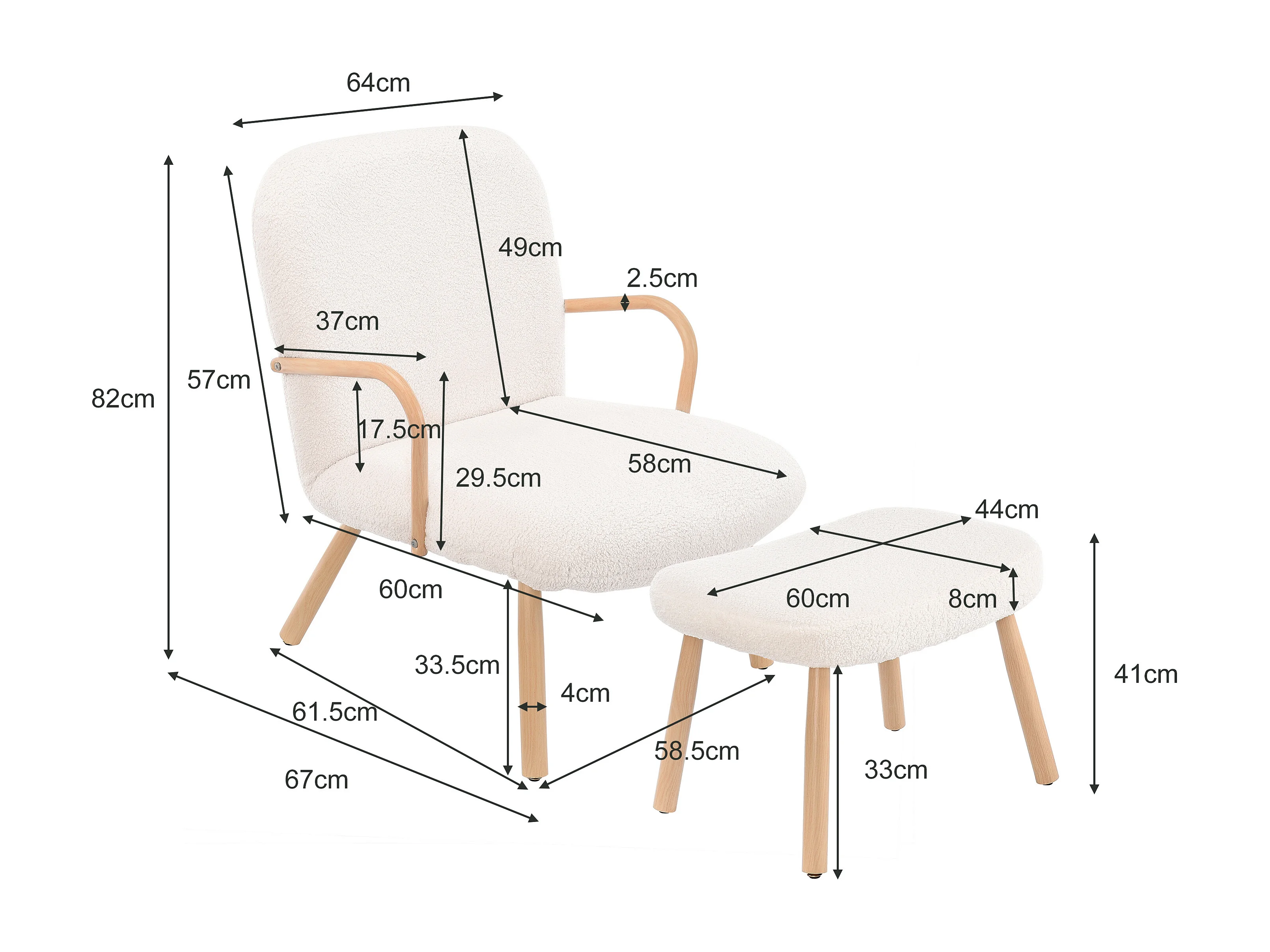 Fauteuil paresseux en tissu blanc crème Velours avec repose-pieds, style scandinave, fauteuil 82x67x64 cm - repose-pieds 41x60x44 cm