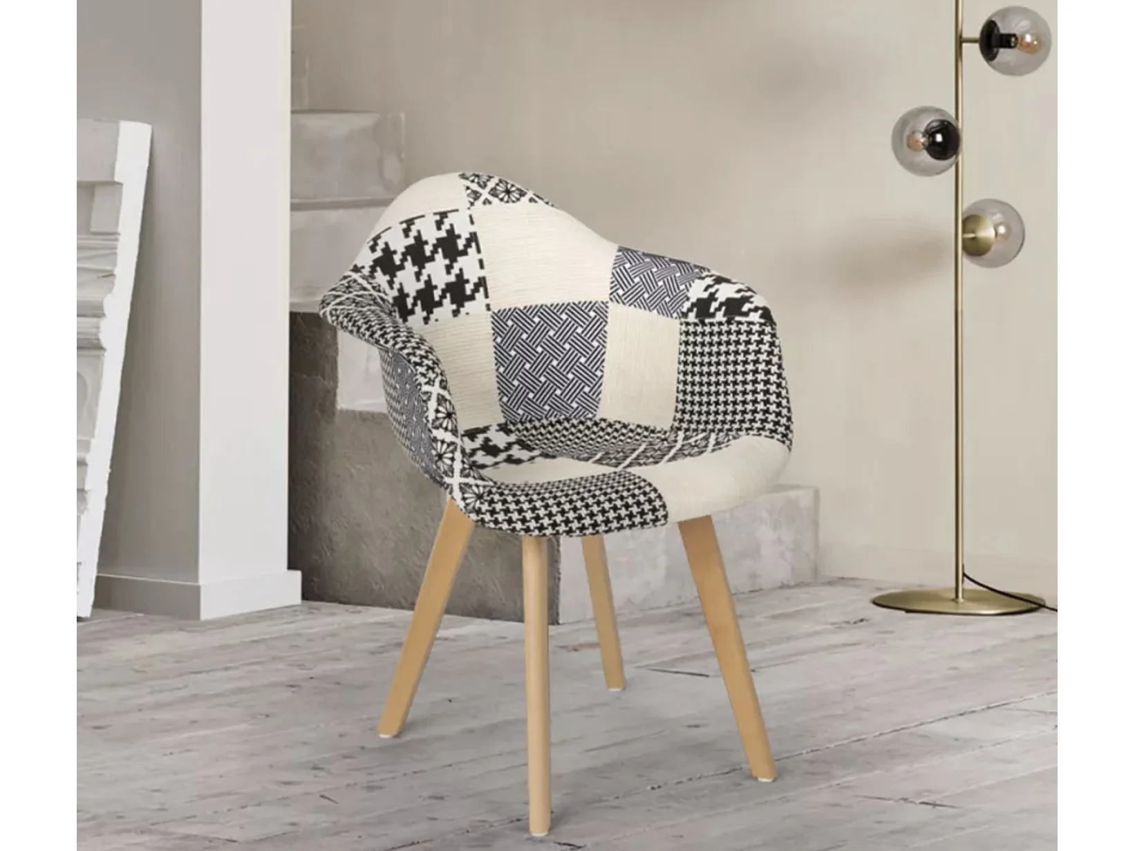 Fauteuil patchwork gris et blanc et pied hêtre naturel Karoli