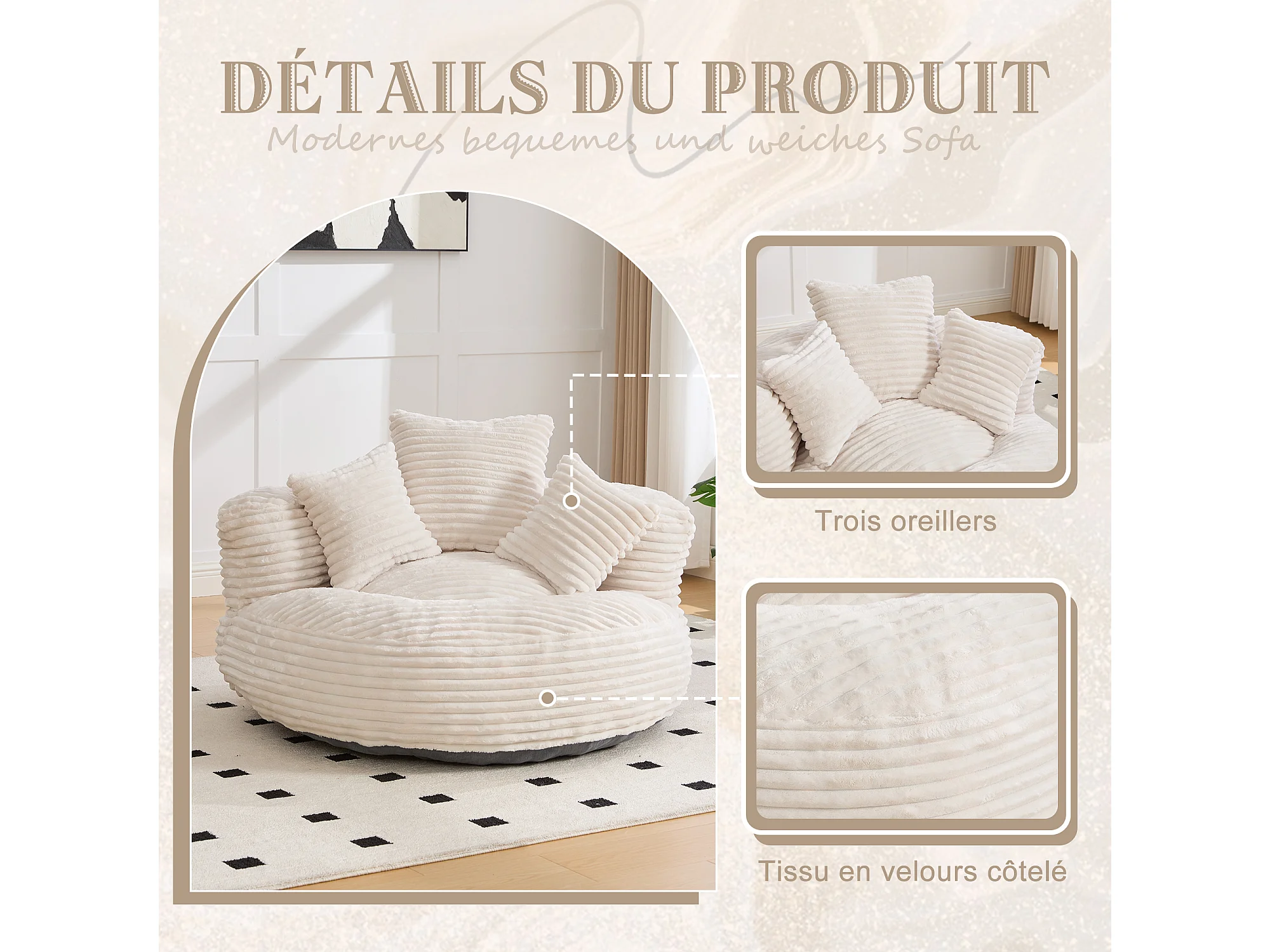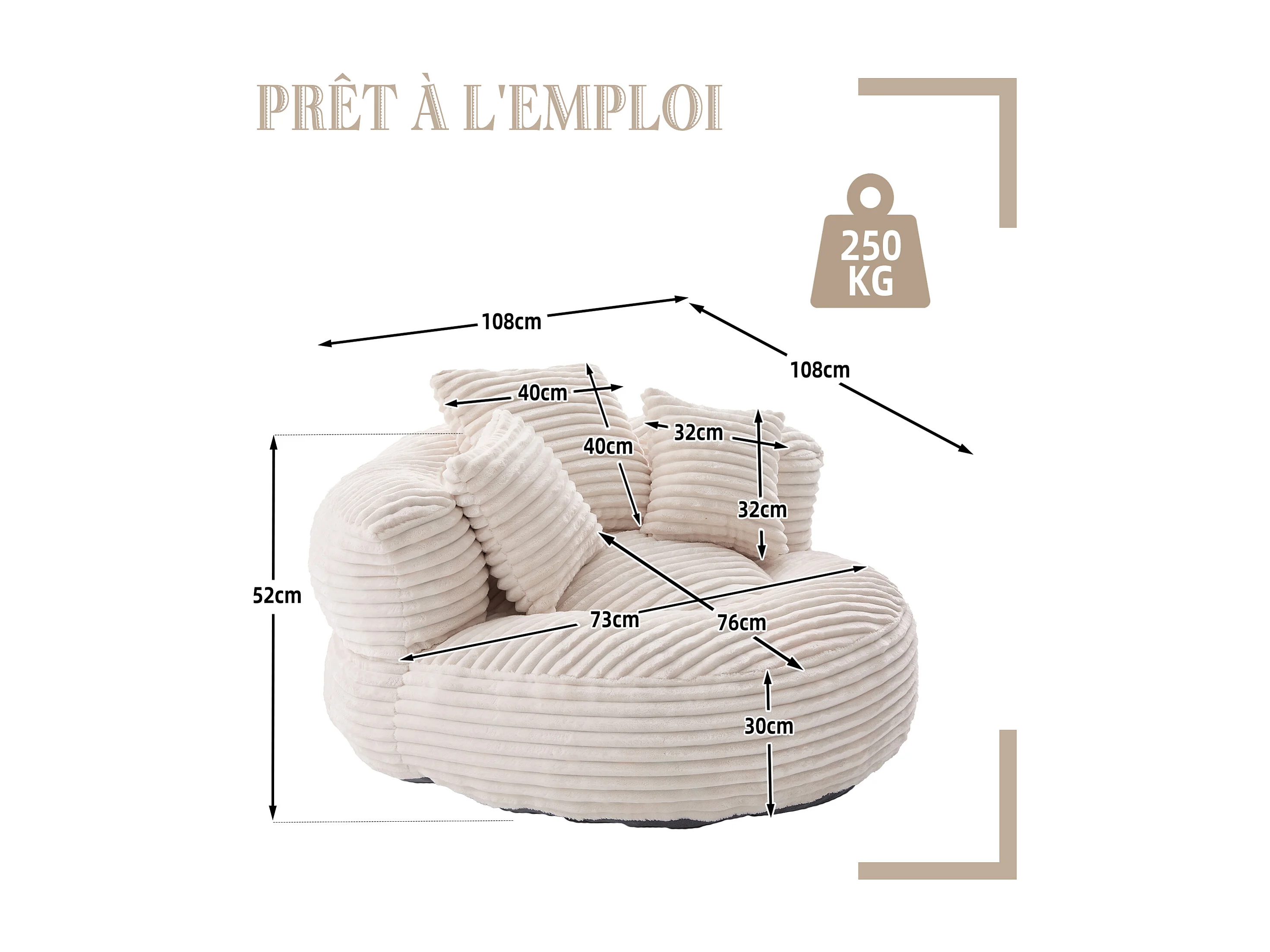 Fauteuil poire en velours côtelé - Pouf Beige – Grand modèle – 3 coussins inclus – Ultra moelleux – Pour adultes et enfants