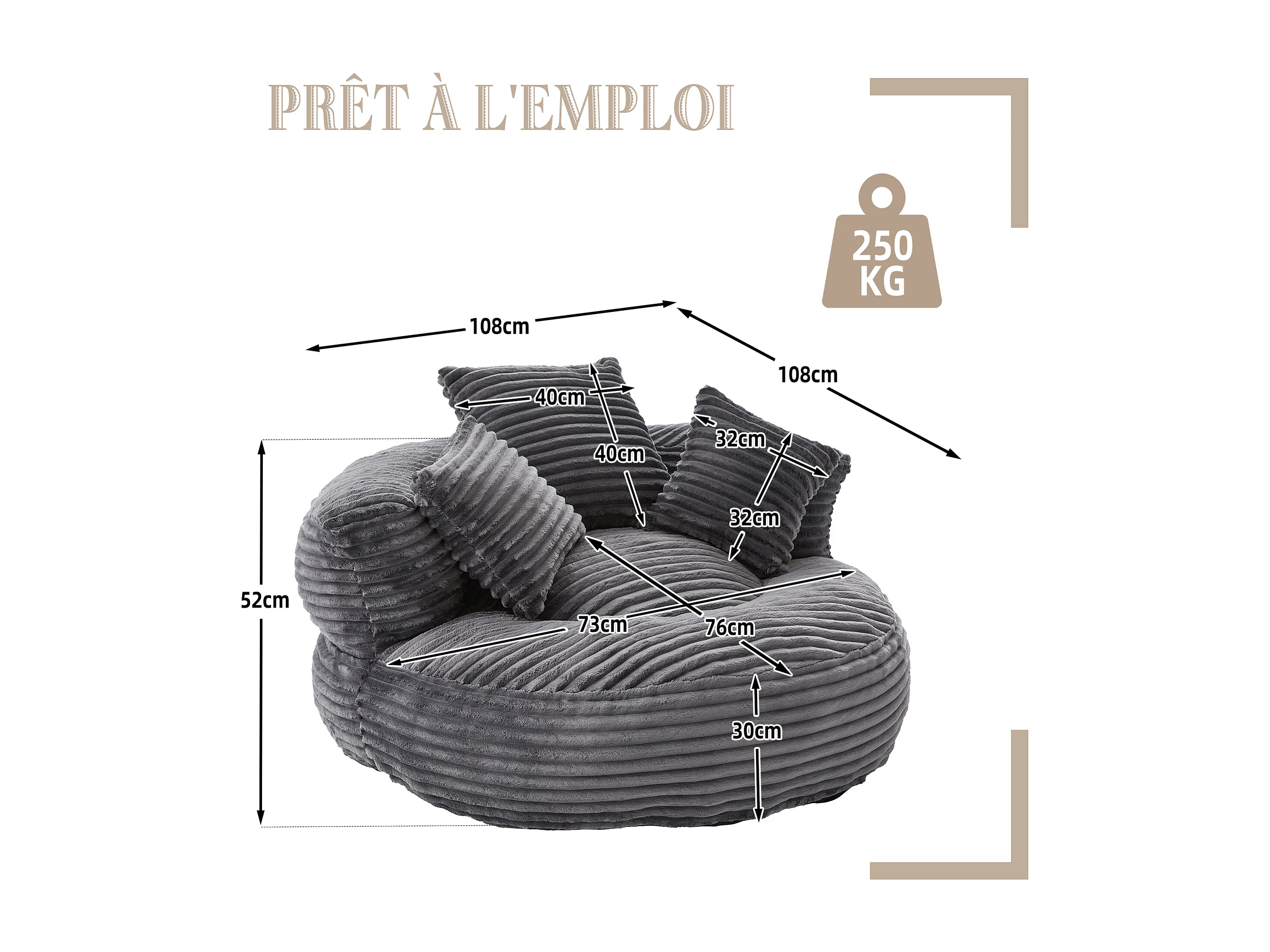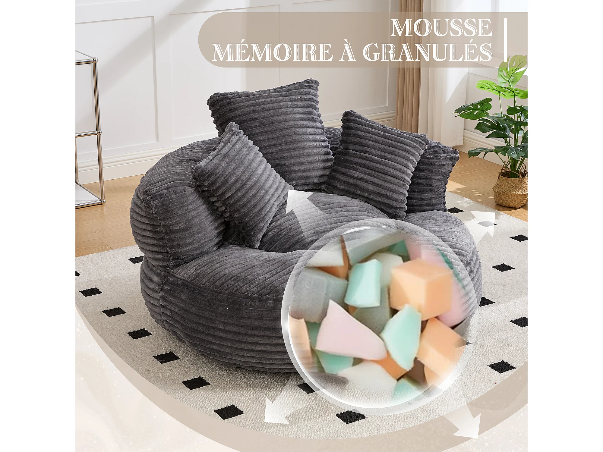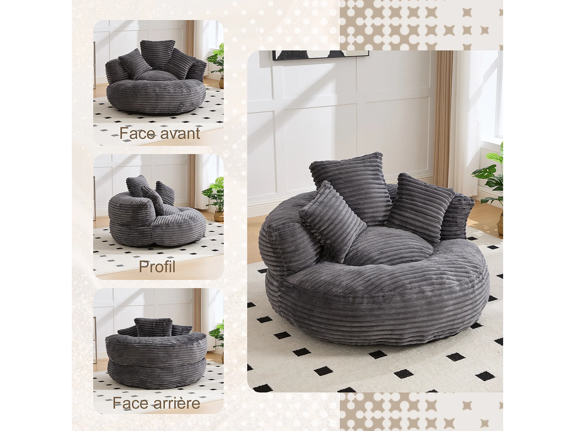 Fauteuil poire en velours côtelé - Pouf gris anthracite – Grand modèle – 3 coussins inclus – Ultra moelleux – Pour adultes et enfants