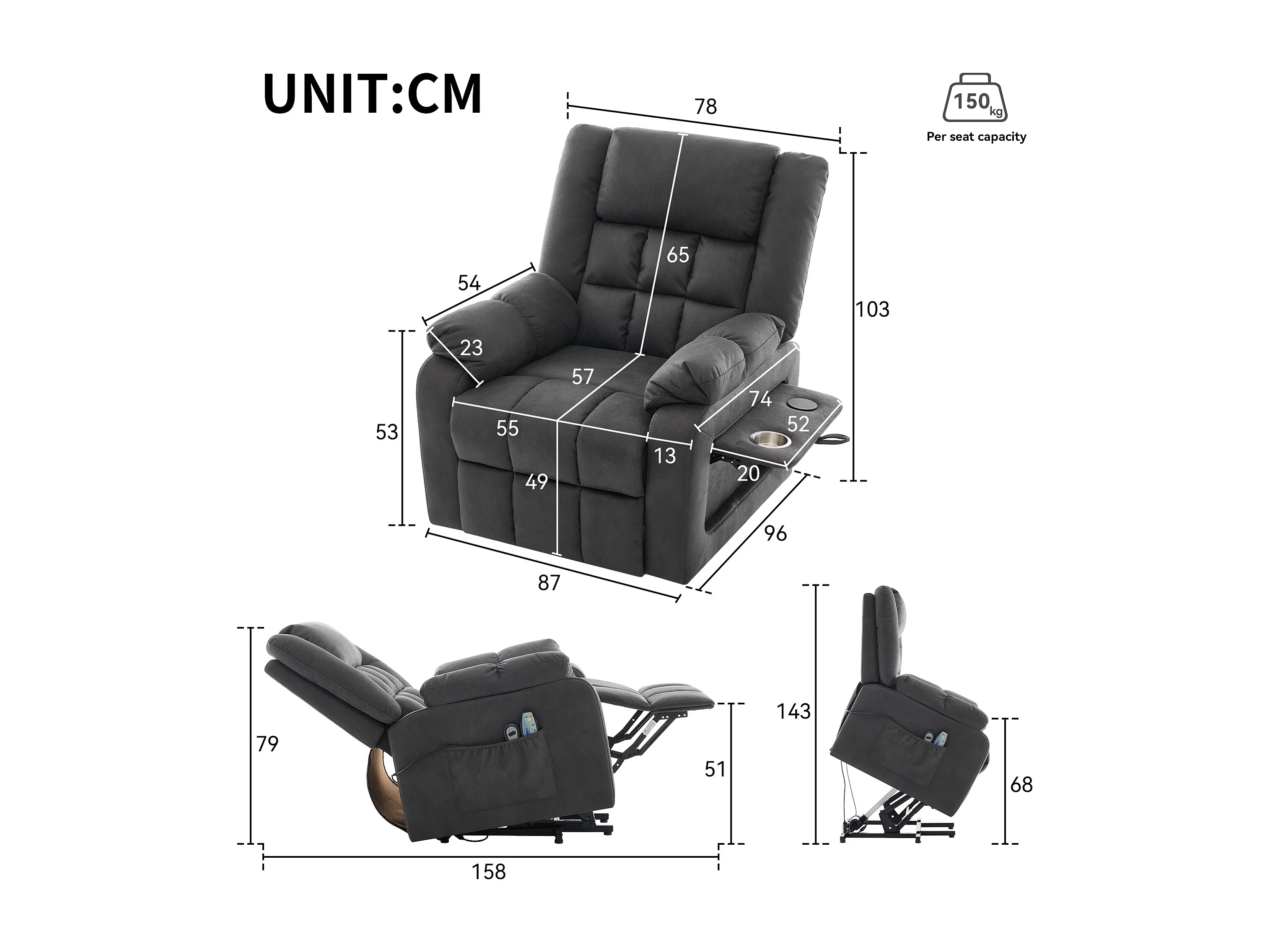 Fauteuil relax électrique avec fonction massage et chauffage - Poches latérales et USB - Gris