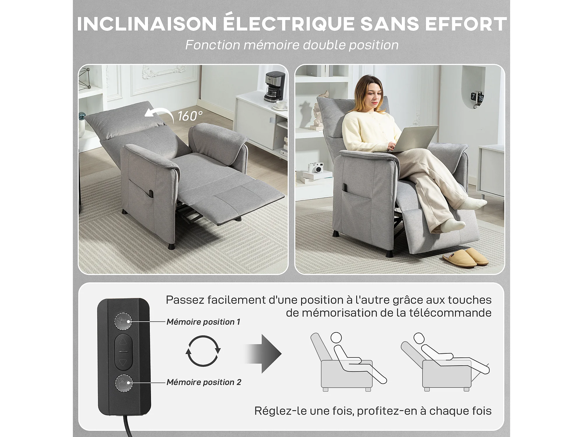 Fauteuil relax électrique inclinable repose-pieds rétractable télécommande velours gris
