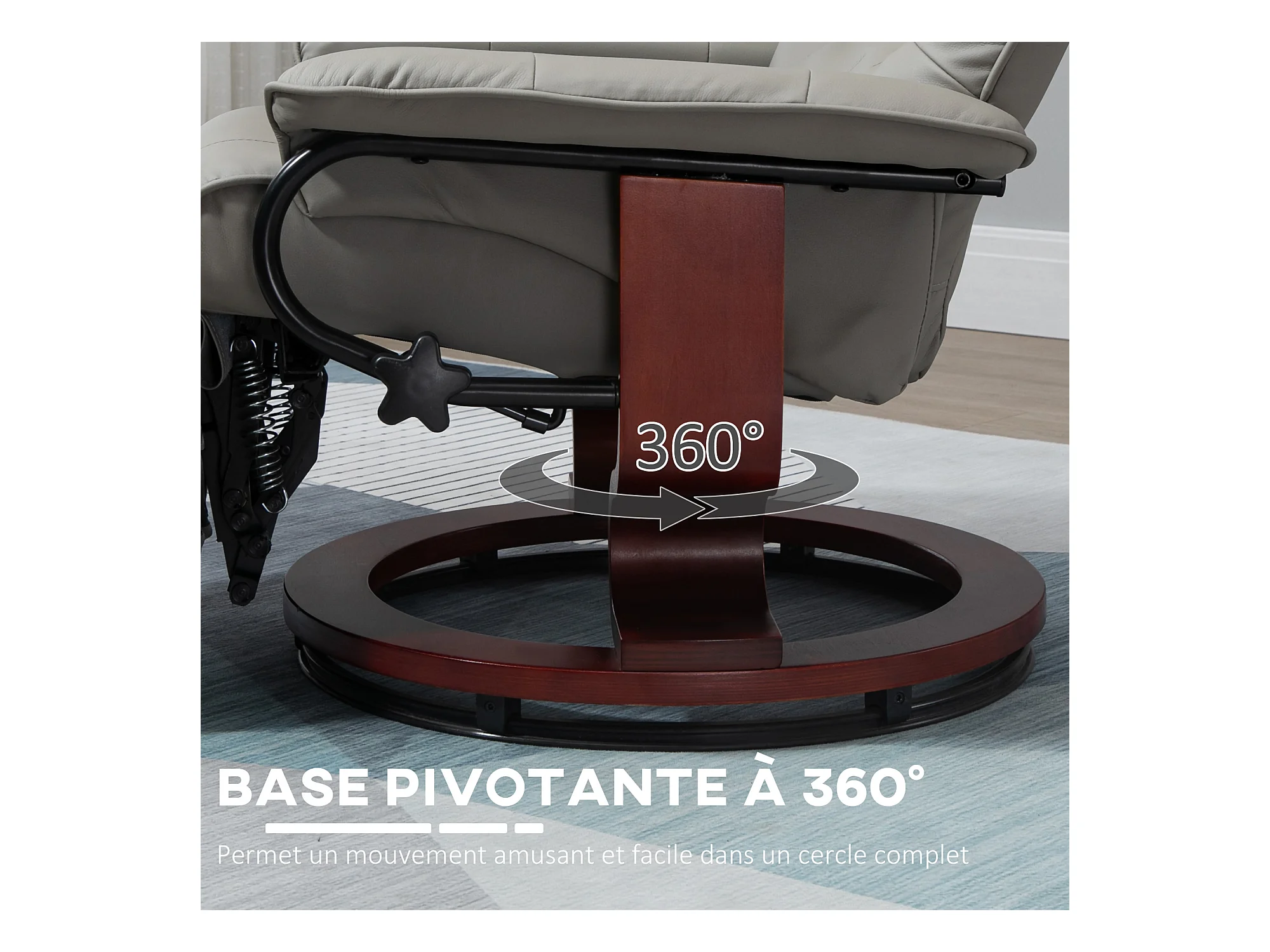 Fauteuil relax inclinable pivotant repose-pied réglable piètement bois revêtement synthétique gris