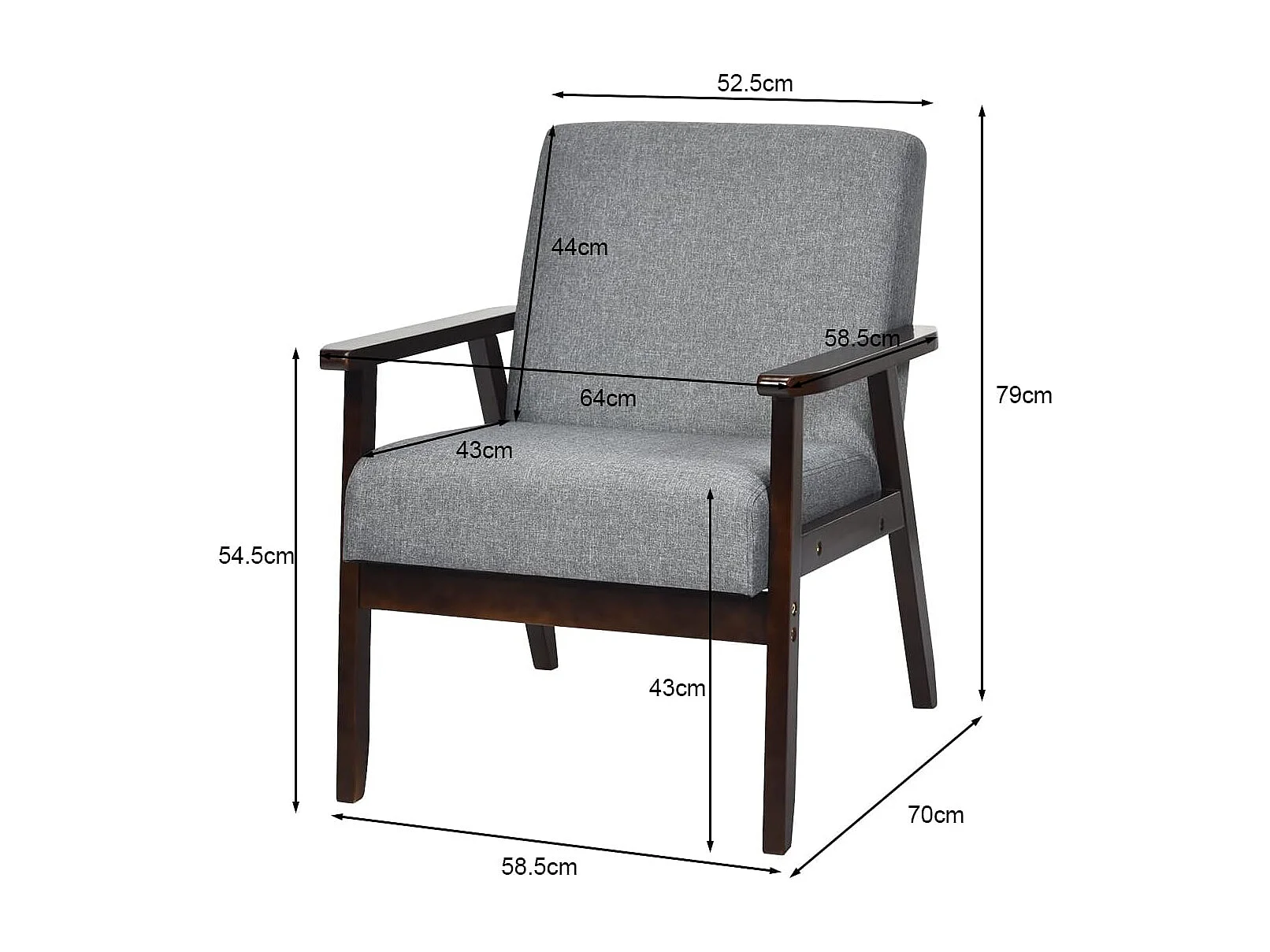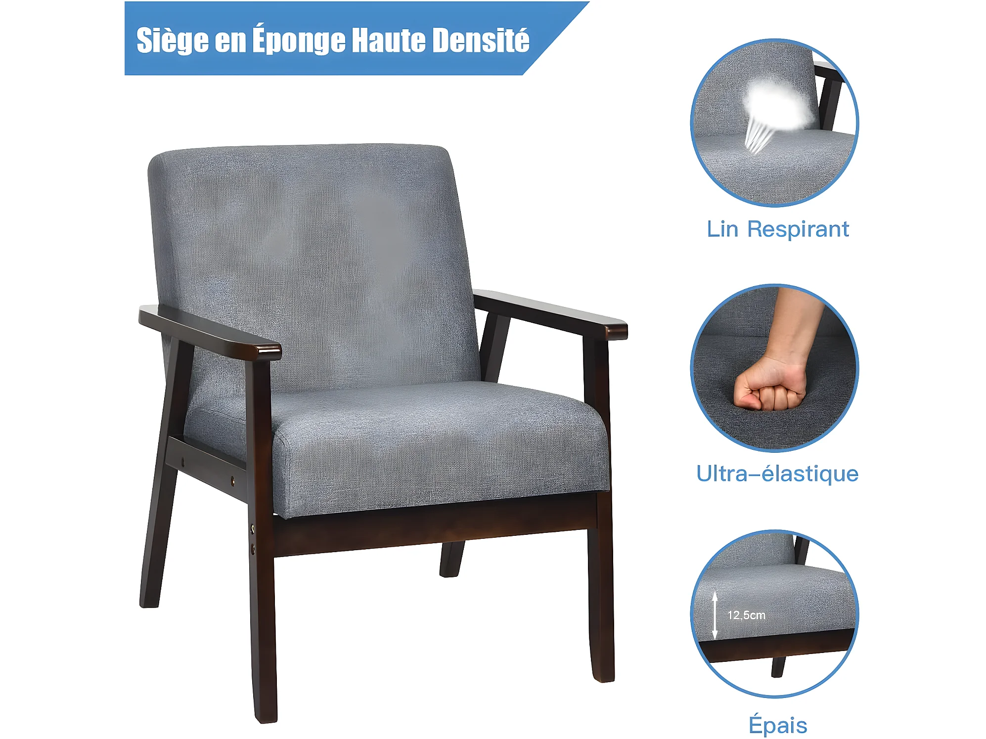 Fauteuil Salon/Chaise Rétro, Rembourrée Souple Cadre en Bois d'Hévéa,Surface en Tissu Lin, pour Salon, Bureau, Balcon Gris