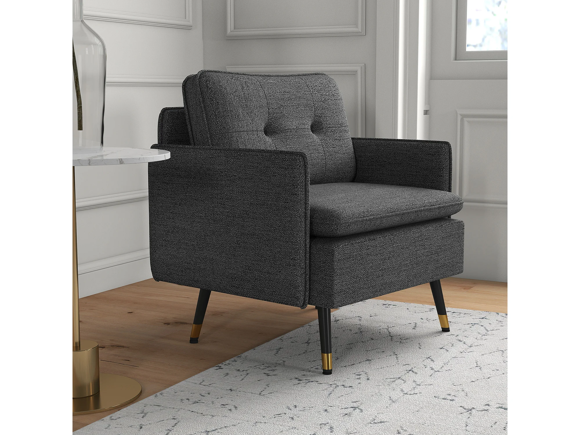 Fauteuil style art-déco dossier effet capitonné piètement incliné effilé métal noir extrémités dorées tissu anthracite