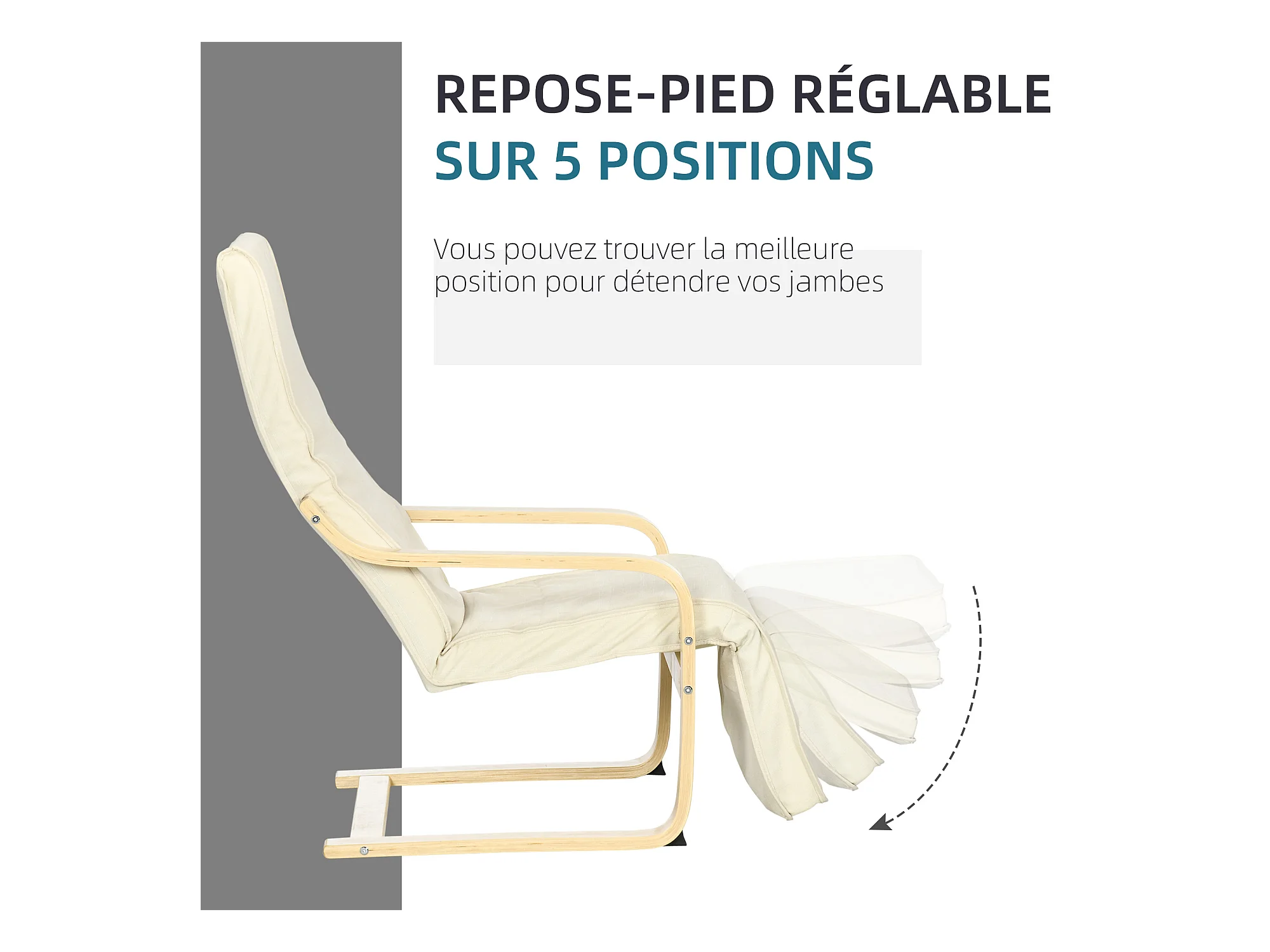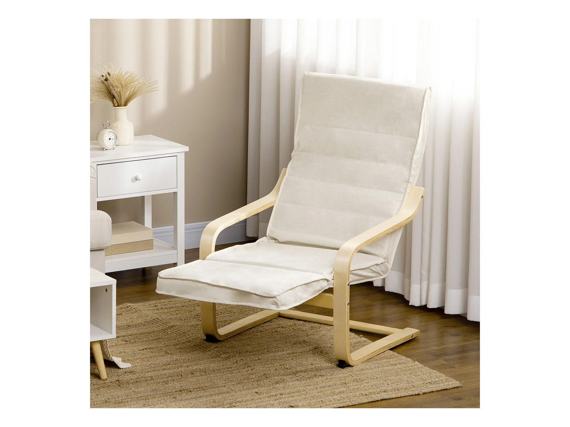 Fauteuil style nordique - repose-pied réglable - déhoussable - bois de bouleau tissu crème