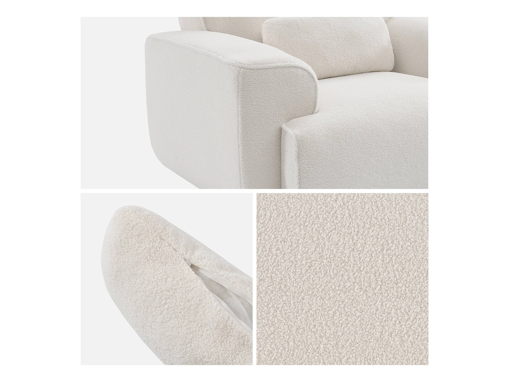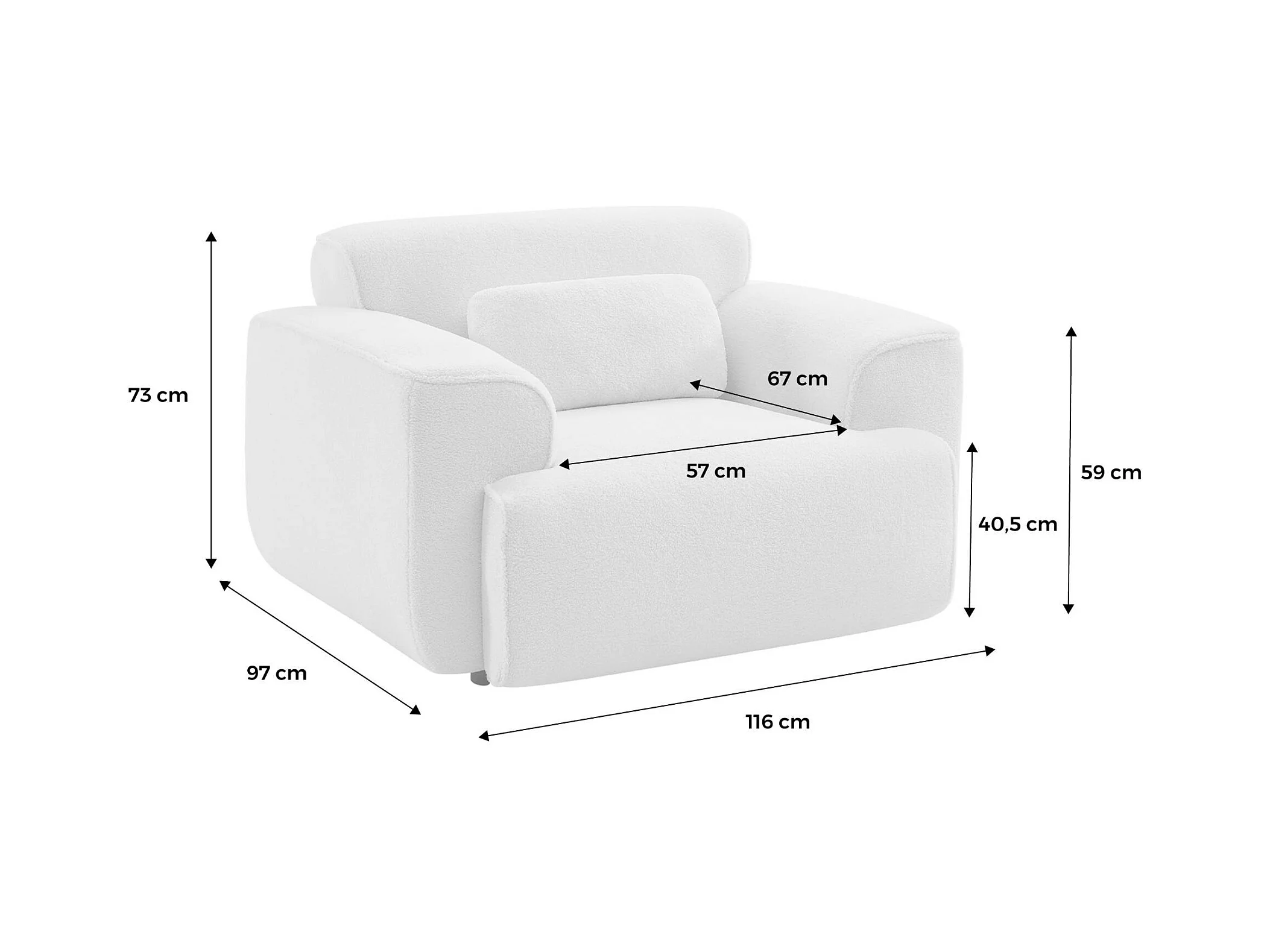 Fauteuil tissu bouclette crème. lignes arrondis. coussin fourni. Wallas. L 116 x P 97 x H 73cm