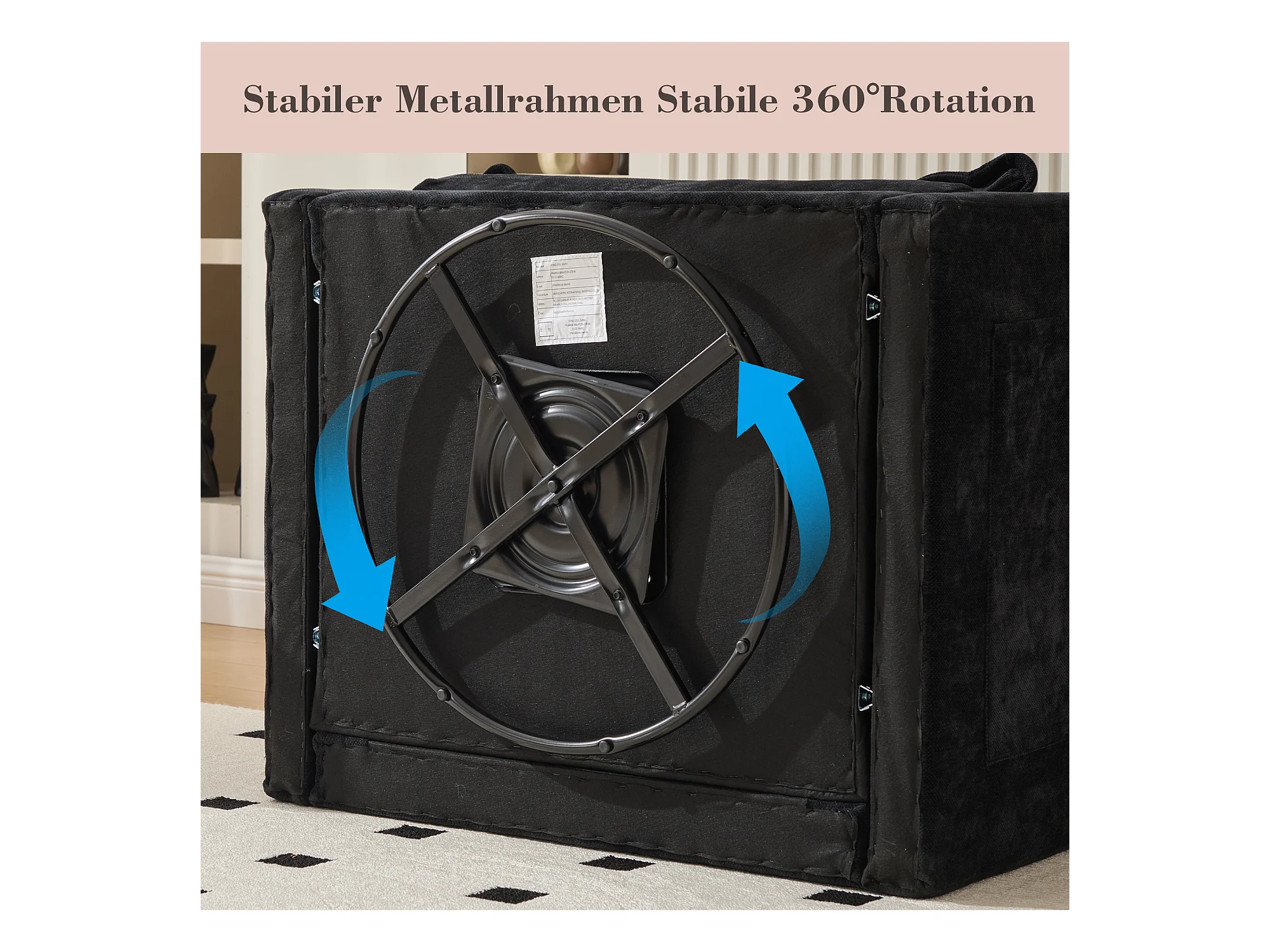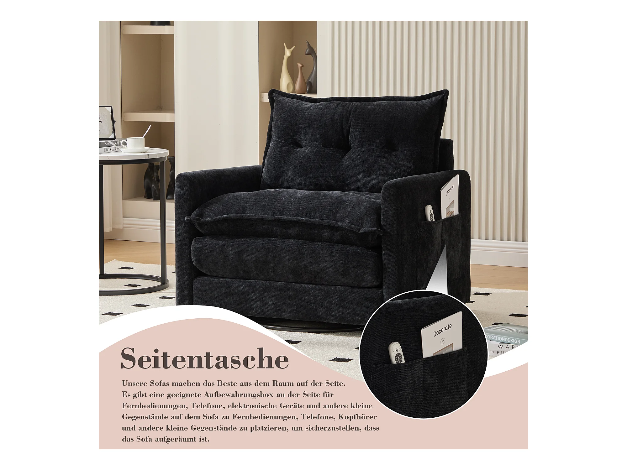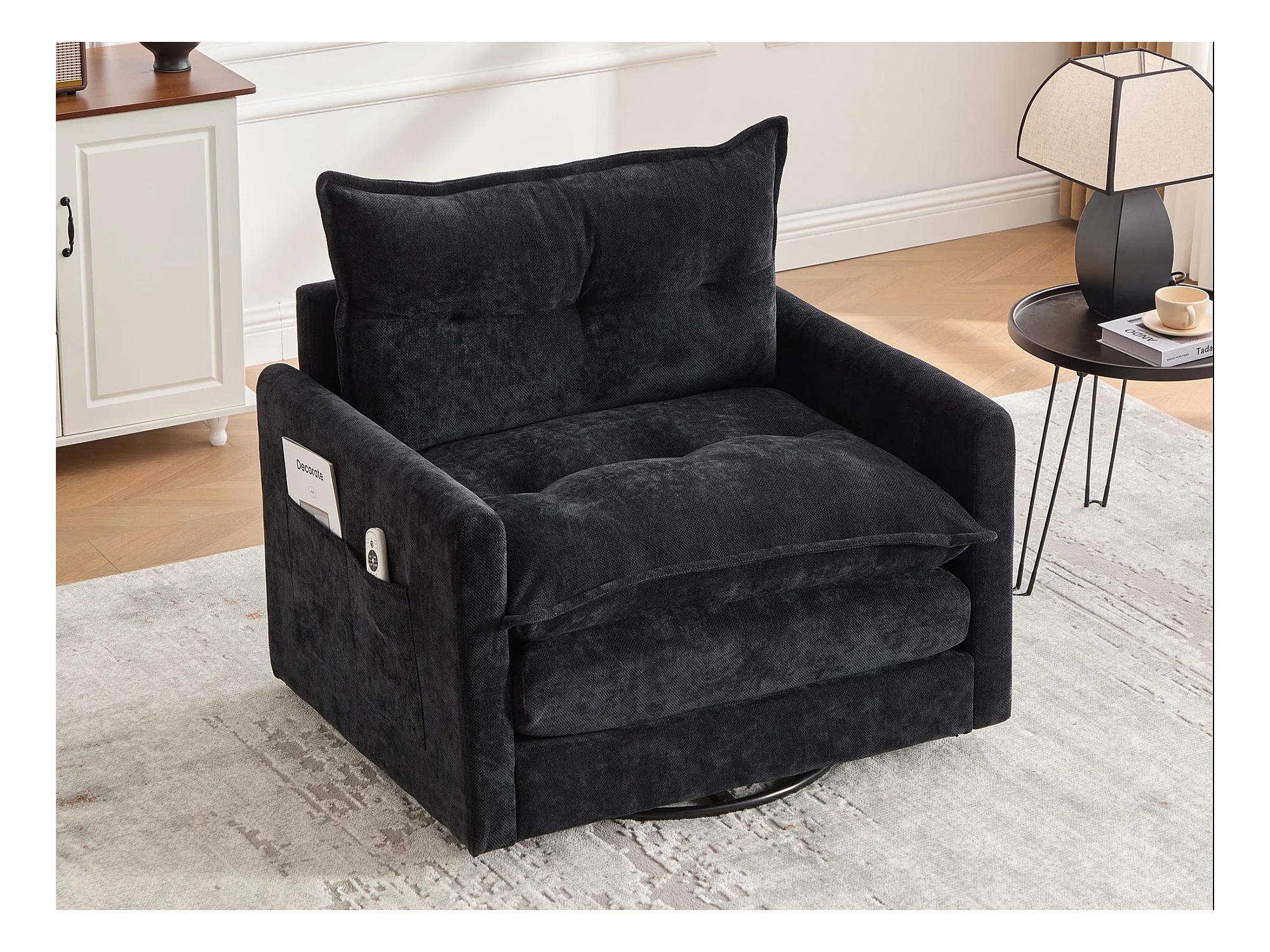 Fauteuil pivotant 360° noir – double couche d’assise, confort optimal et poche latérale – idéal pour salon, chambre et bureau