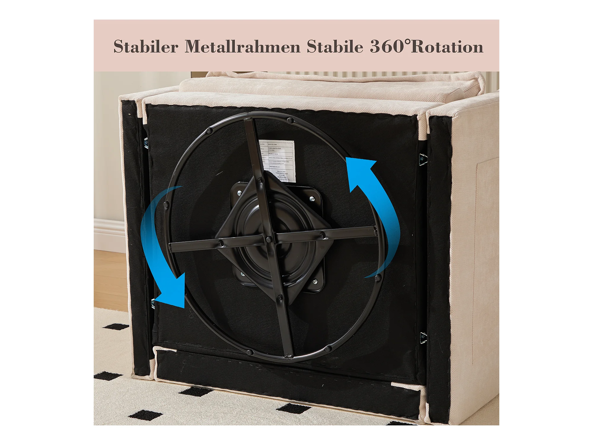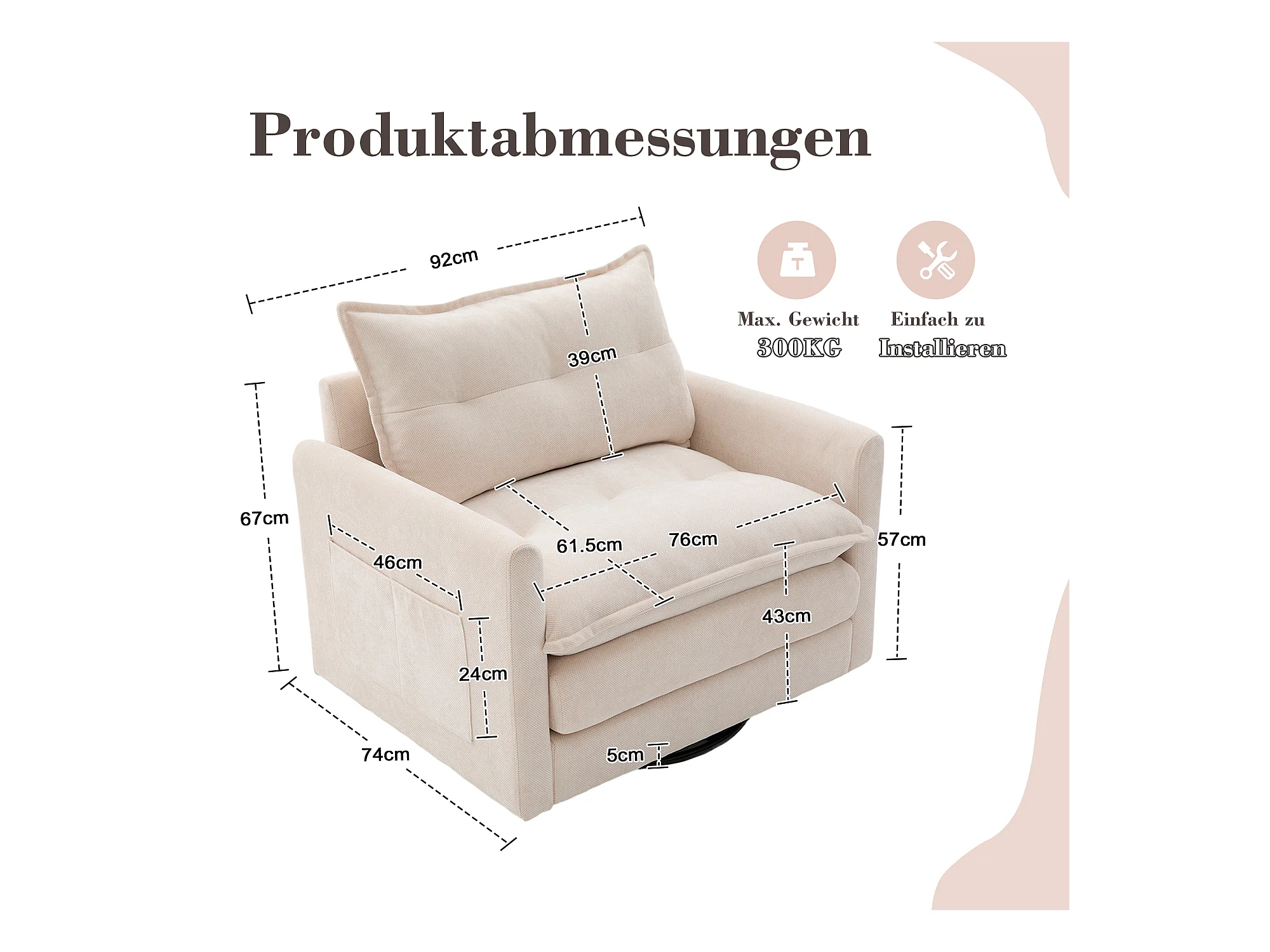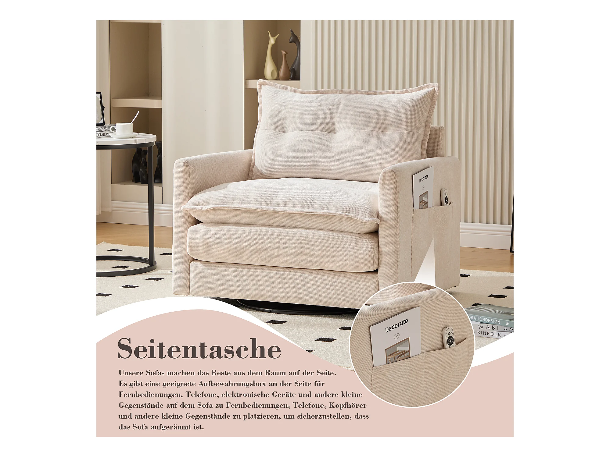 Fauteuil pivotant 360° beige – double couche d’assise, confort optimal et poche latérale – idéal pour salon, chambre et bureau