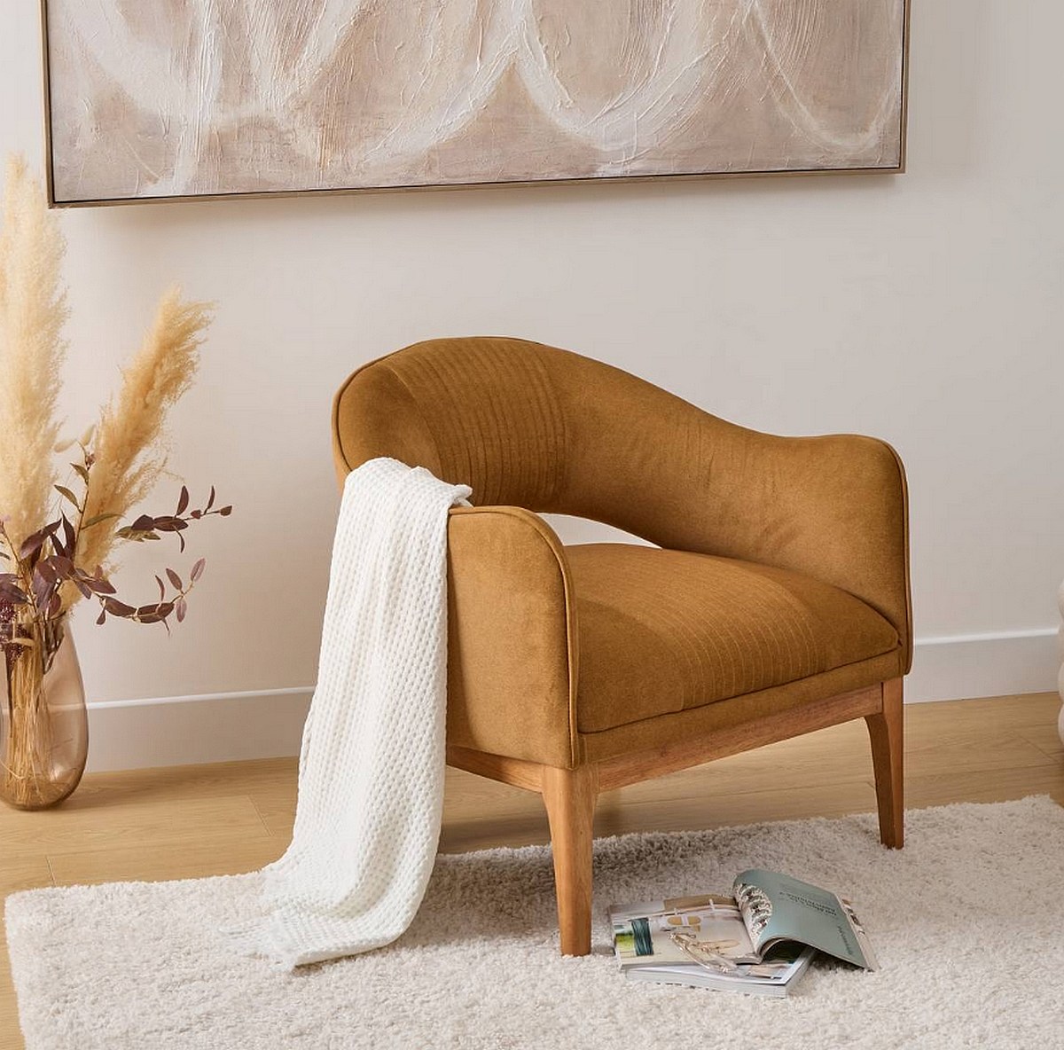 Fauteuil vintage en velours côtelé camel - Longueur 78 x Profondeur 74 x Hauteur 75,5 cm