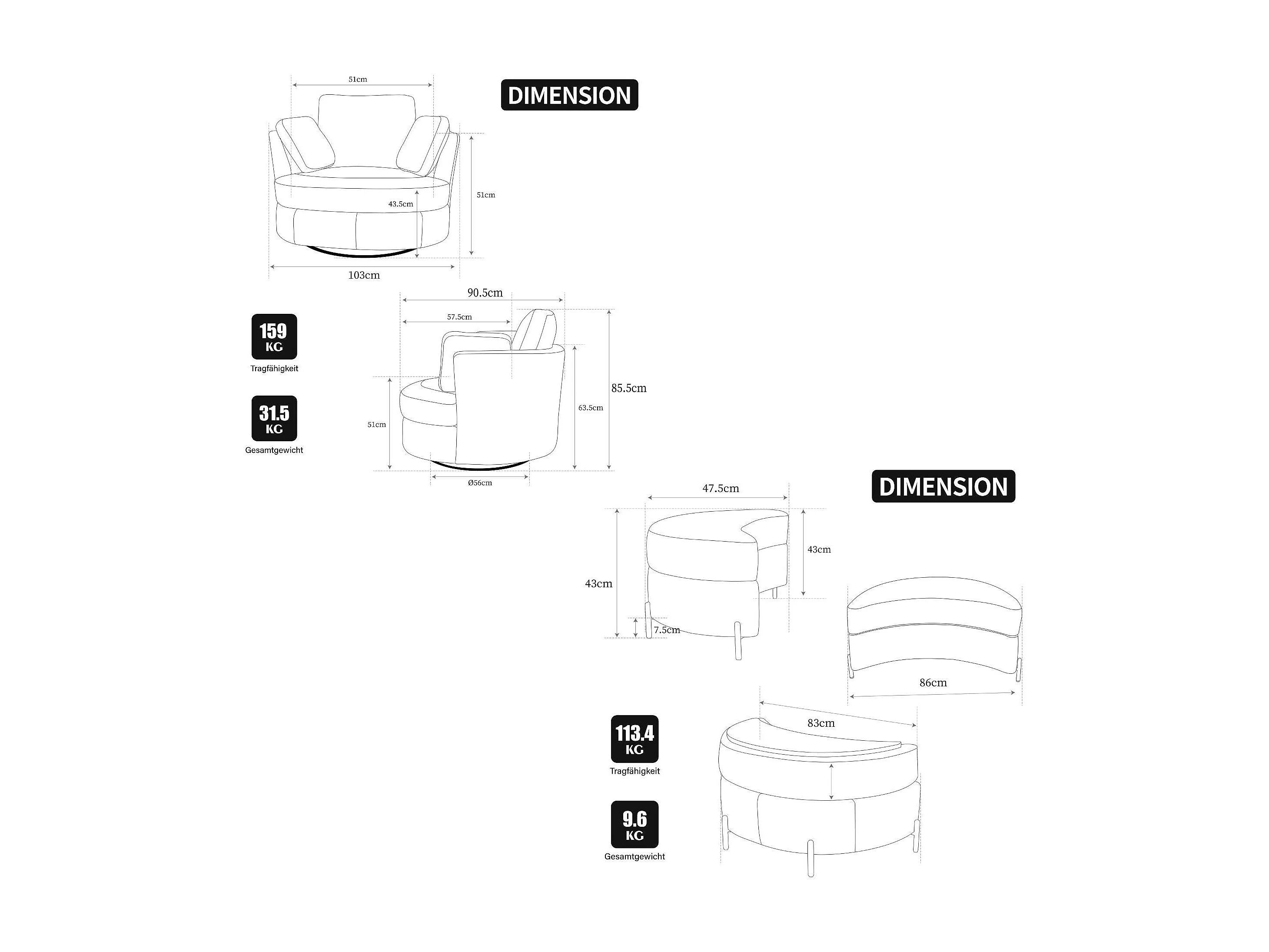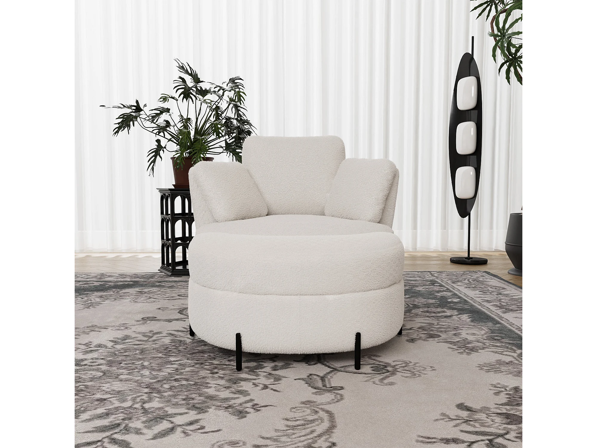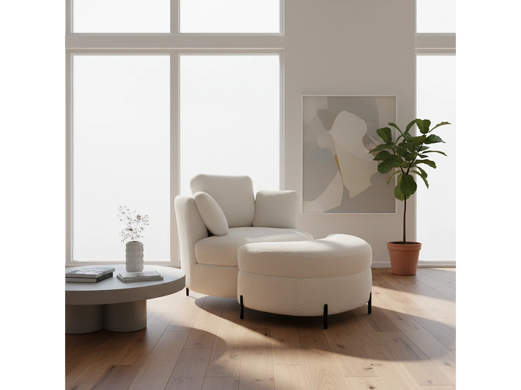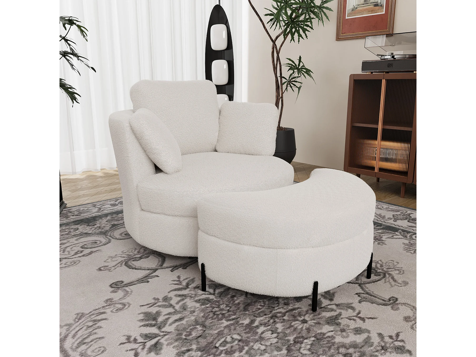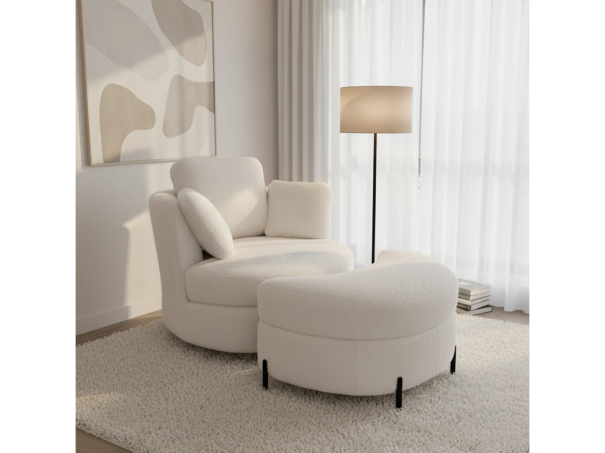 Fauteuil XXL moderne bouclé beige 3 coussins avec pouf ultra-confortable