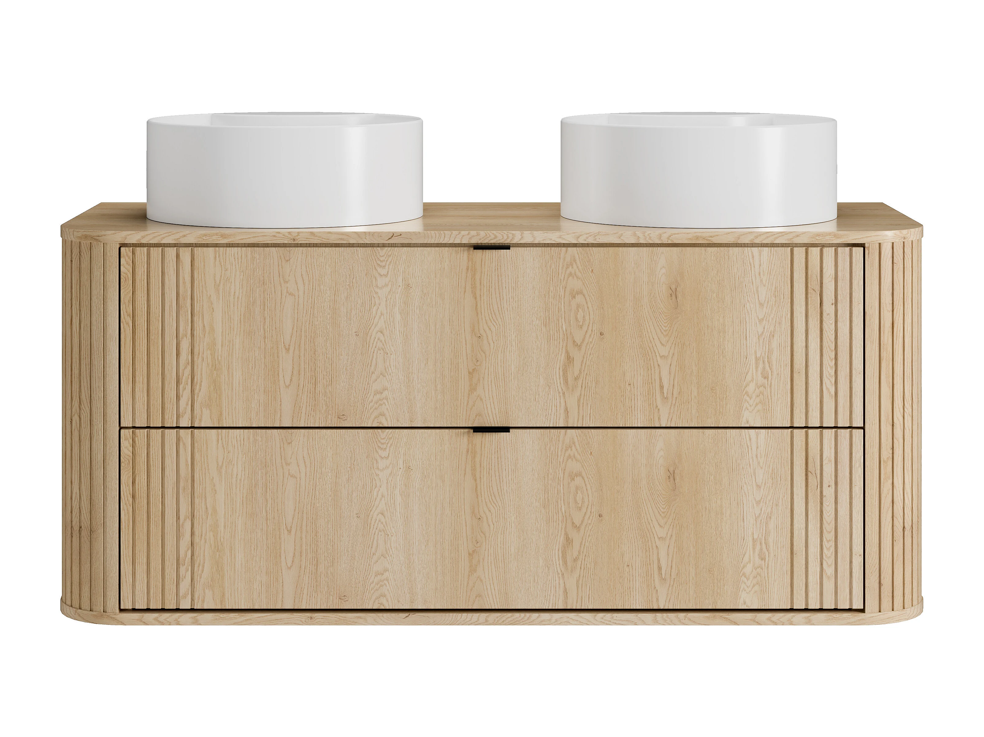 Meuble de salle de bain suspendu avec double vasque à poser ronde et colonne - Naturel clair - 120 cm - FILOR
